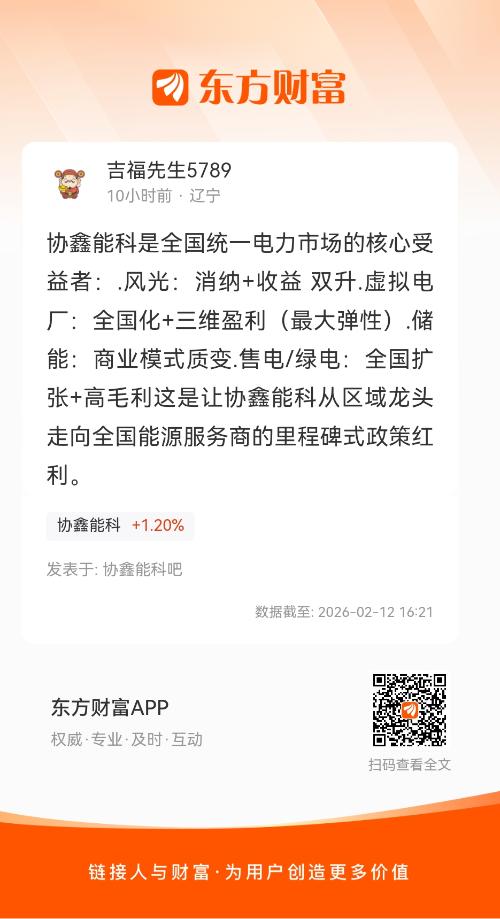协鑫能科是全国统一电力市场的核心受益者:.风光:消纳+收益 双升.虚拟电厂:全国化+三维盈利(最大弹性).储能:商业模式质变.售电/绿电:全国扩张+高毛利这是让协鑫能科从区域龙头走向全国能源服务商的里程碑式政策红利。