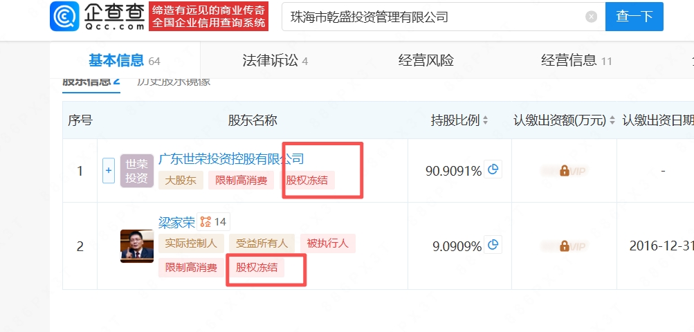 $世荣兆业(SZ002016)$ 只要工商局信息是对的,梁家荣持有乾盛100%股份就跑不了,赔偿世荣是足够赔的