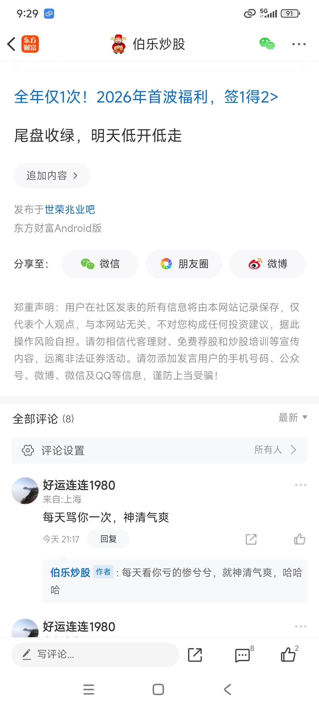 温馨提示: 1.根据《证券法》规定,禁止编造、传播虚假信息或者误导性信息,扰乱证券市场;2.用户在本社区发表的所有资料、言论等仅代表个人观点,与本网站立场无关,不对您构成任何投资建议。用户应基于自己的独立判断,自行决定证券投资并承担相应风险。《东方财富社区管理规定》