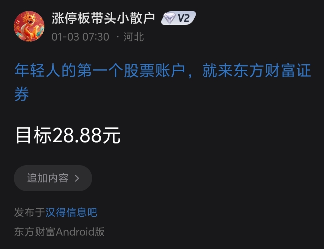 温馨提示: 1.根据《证券法》规定,禁止编造、传播虚假信息或者误导性信息,扰乱证券市场;2.用户在本社区发表的所有资料、言论等仅代表个人观点,与本网站立场无关,不对您构成任何投资建议。用户应基于自己的独立判断,自行决定证券投资并承担相应风险。《东方财富社区管理规定》