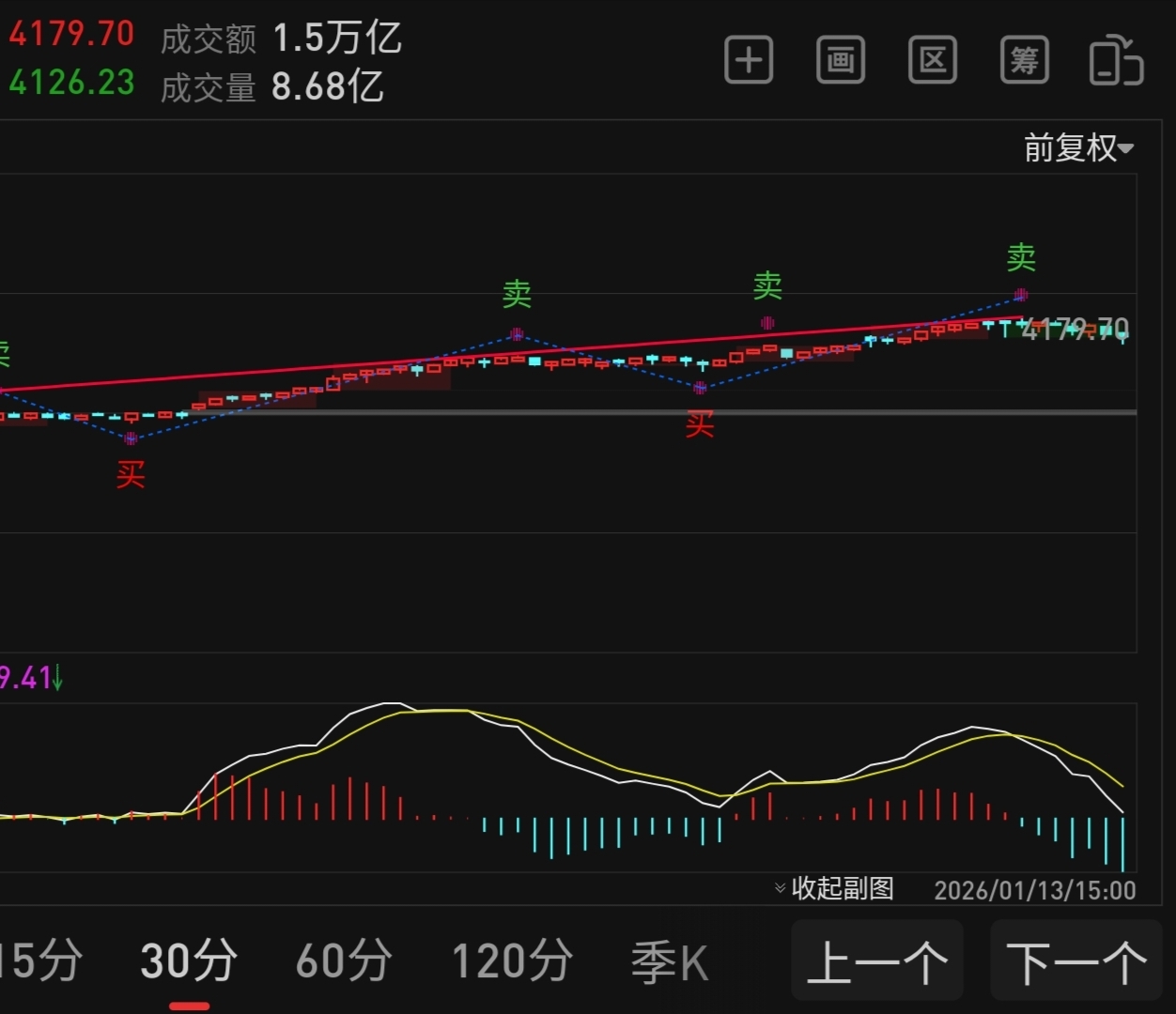 $世荣兆业(SZ002016)$ 上证指数30分钟图(也就是始于3815的日线小五),暂定今天的高点是蓝色第三段的顶部,因为蓝色一段和蓝色第三段今天时间到位,空间刚好1.382-2。接下来就是蓝色4,蓝四和蓝二,对应时间拉下来也就4080这个位置,如果4034更好,后面就是蓝色第五段了。目前季度线压力已经上移到4217