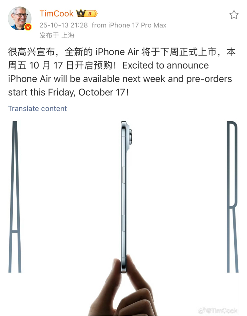 库克宣布iPhoneAir本周五上午9:00正式开启预约,10月22日正式发售,
