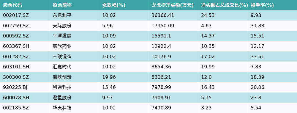 南财智讯10月17日电,南财金融终端数据显示,因当日异动登上龙虎榜的个股中,资金净买入最多的前三位分别是东信和平(002017.SZ)、天际股份(002759.SZ)与平潭发展(000592.SZ)。其中排名第一的东信和平净买额达3.64亿元,占总成交金额的24.53%。东信和平当日收盘上涨10.02%,换手率为9.93%,净买入额前10个股详情见下图: