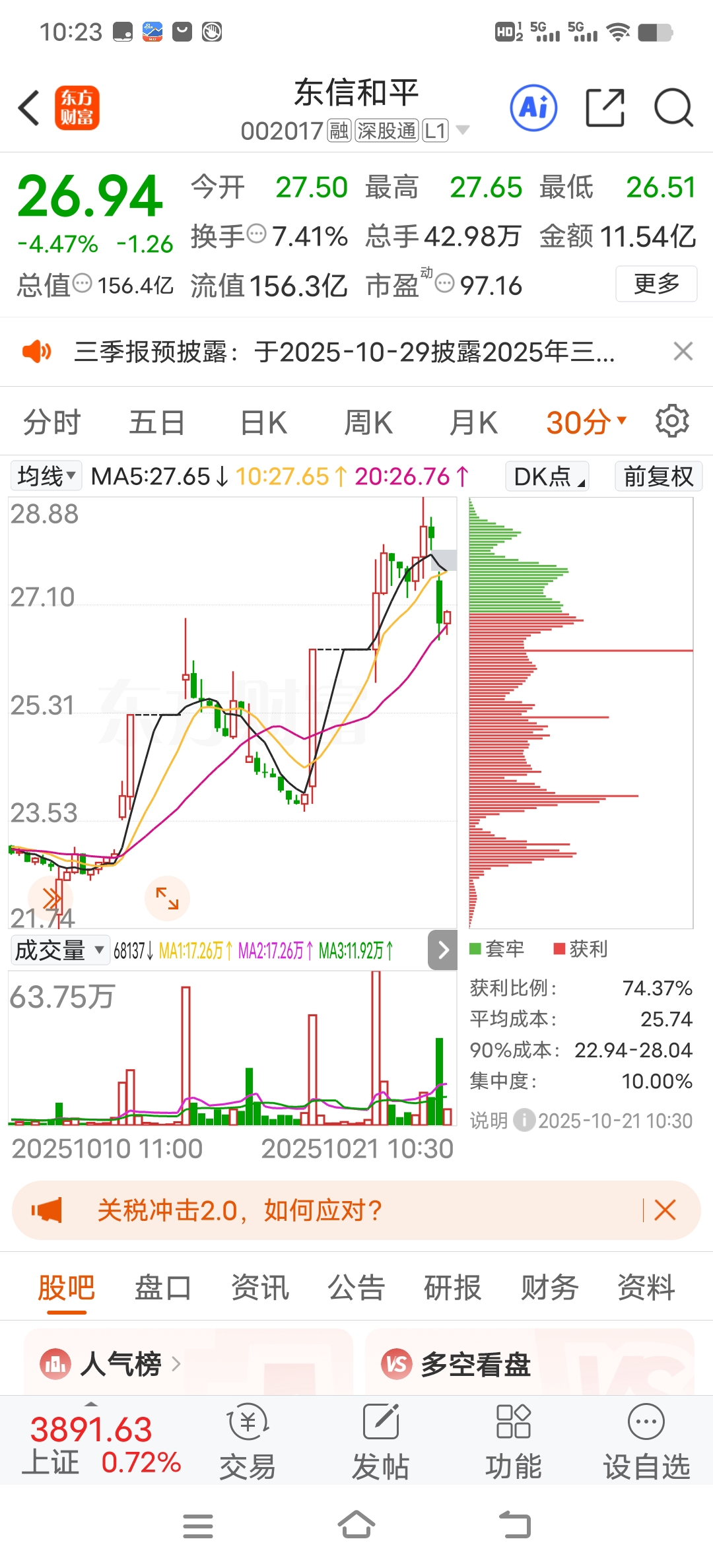 $东信和平(SZ002017)$ 30分钟 不破20日线 没事