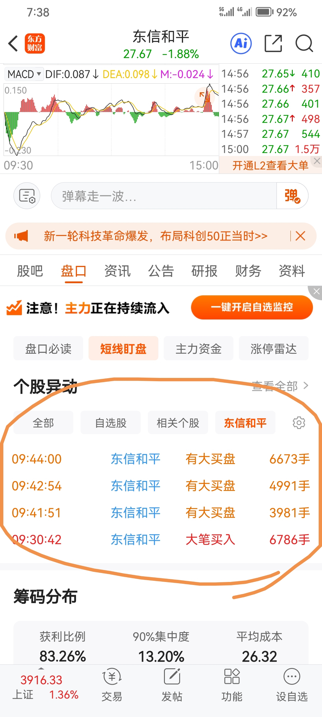 $东信和平(SZ002017)$ 个股亮点:“手机核心技术供应商+主力高度控盘+低价”。放大东信和平日k线图走势非常漂亮,昨天竞价直至低开主力用意就是制造恐慌情绪,让上方堆积大量卖出筹码,然后连续用四单大单吃饱,后面主力收工休息闲游去了,这明显是洗盘+吸筹最阴的手段,今日东信和平必定高开,让抛出或做T者来不及回补,要拾回筹码唯有追高助力主力拉升,这是主力新的玩股方式。