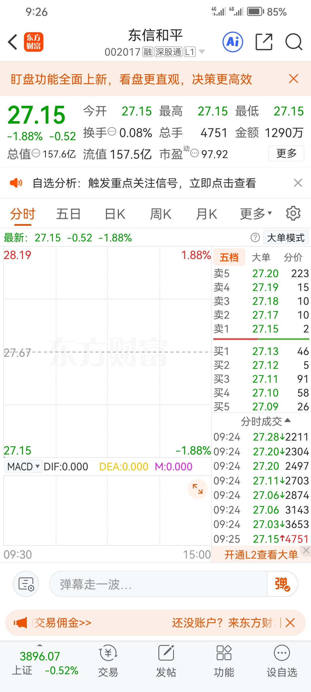 9点15分竞价有意开低,直至9点24分45秒低到27.03元,然后开单27.15元一单把上面合全吃,主力够阴也够狠。