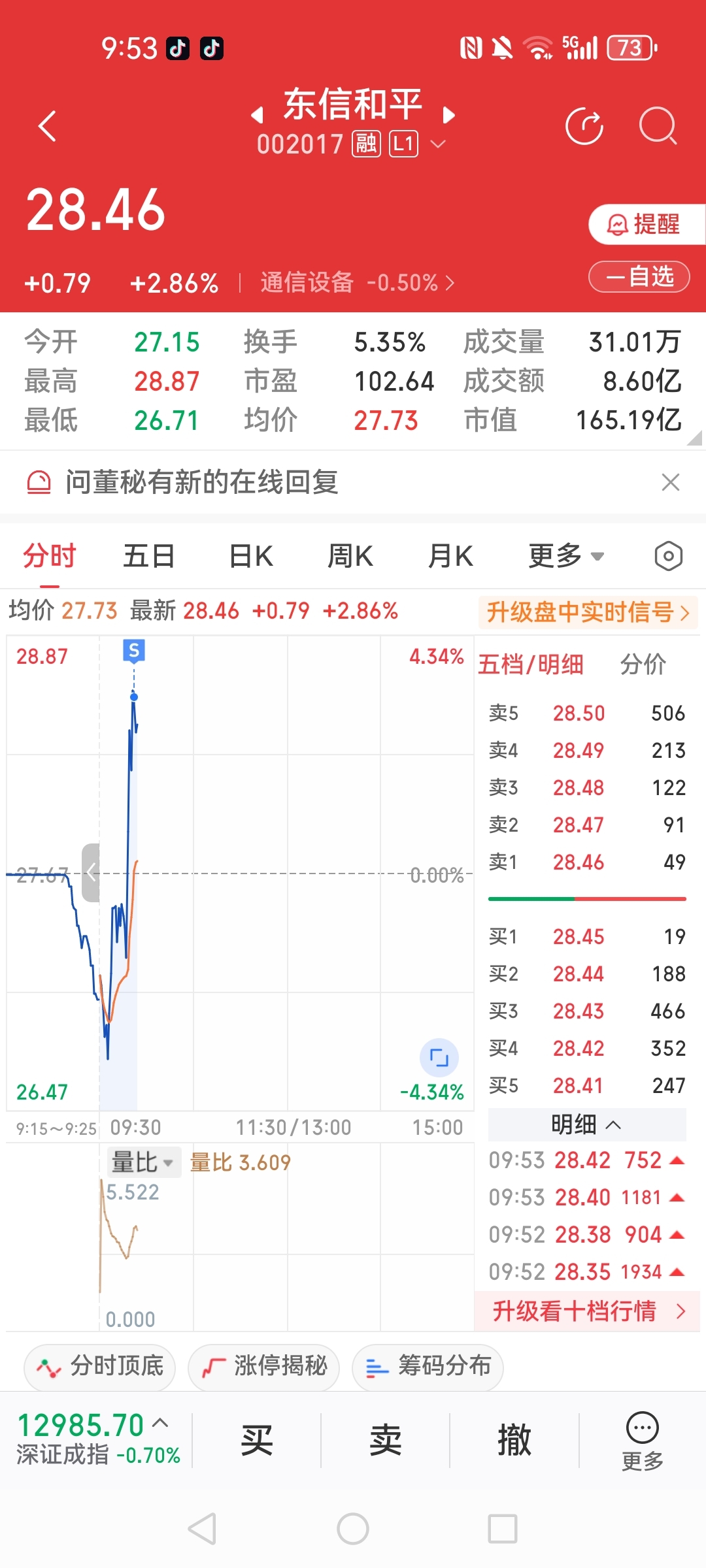 $东信和平(SZ002017)$ 七毛三跑了