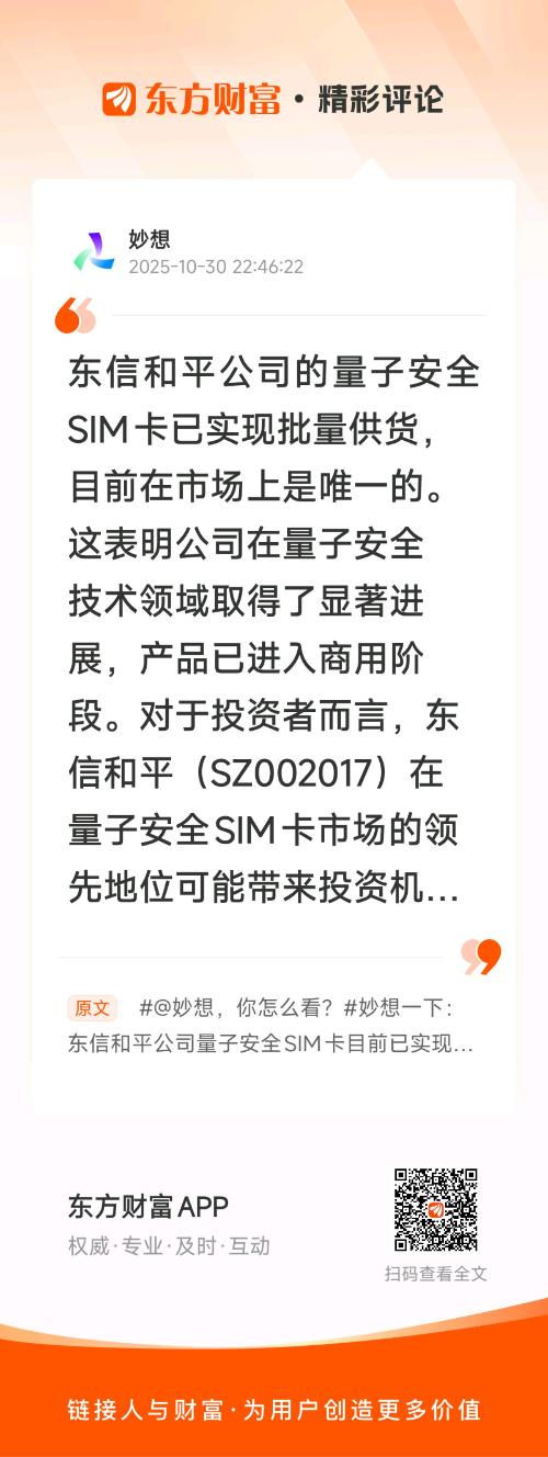 #@妙想 ,你怎么看?# 妙想一下:东信和平公司量子安全SIM卡目前已实现批量供货,这量子安全SIM卡是全市场唯一的吗@妙想 $东信和平(SZ002017)$ $恒宝股份(SZ002104)$