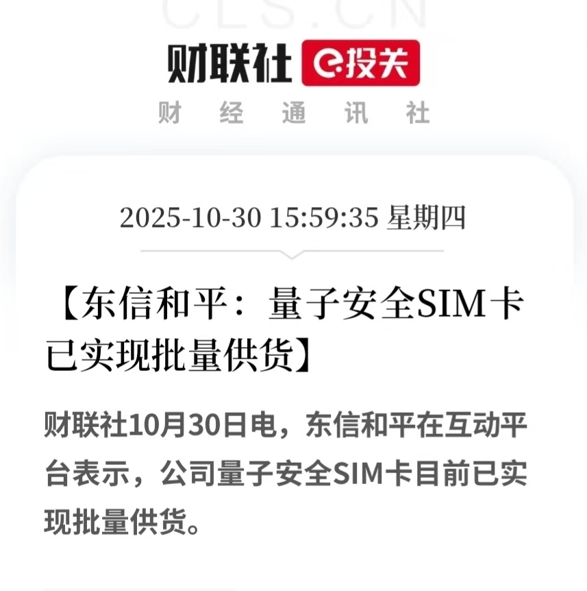 东信和平公司的量子安全SIM卡已实现批量供货,目前在市场上是唯一的。这表明公司在量子安全技术领域取得了显著进展,产品已进入商用阶段。对于投资者而言,东信和平(SZ002017)在量子安全SIM卡市场的领先地位可能带来投资机会$恒宝股份(SZ002104)$