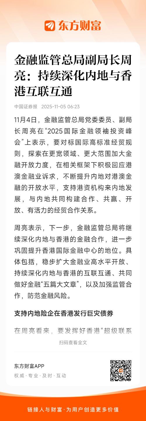 11月4日,金融监管总局党委委员、副局长周亮在“2025国际金融领袖投资峰会”上表示,要对标国际高标准经贸规则,探索在更宽领域、更大范围加大金融开放力度,在相关框架下积极回应港澳金融业诉求,不断提升内地对港澳金融的开放水平,支持港资机构来内地发展,与内地共同构建合作、共赢、开放、有活力的经贸合作关系。