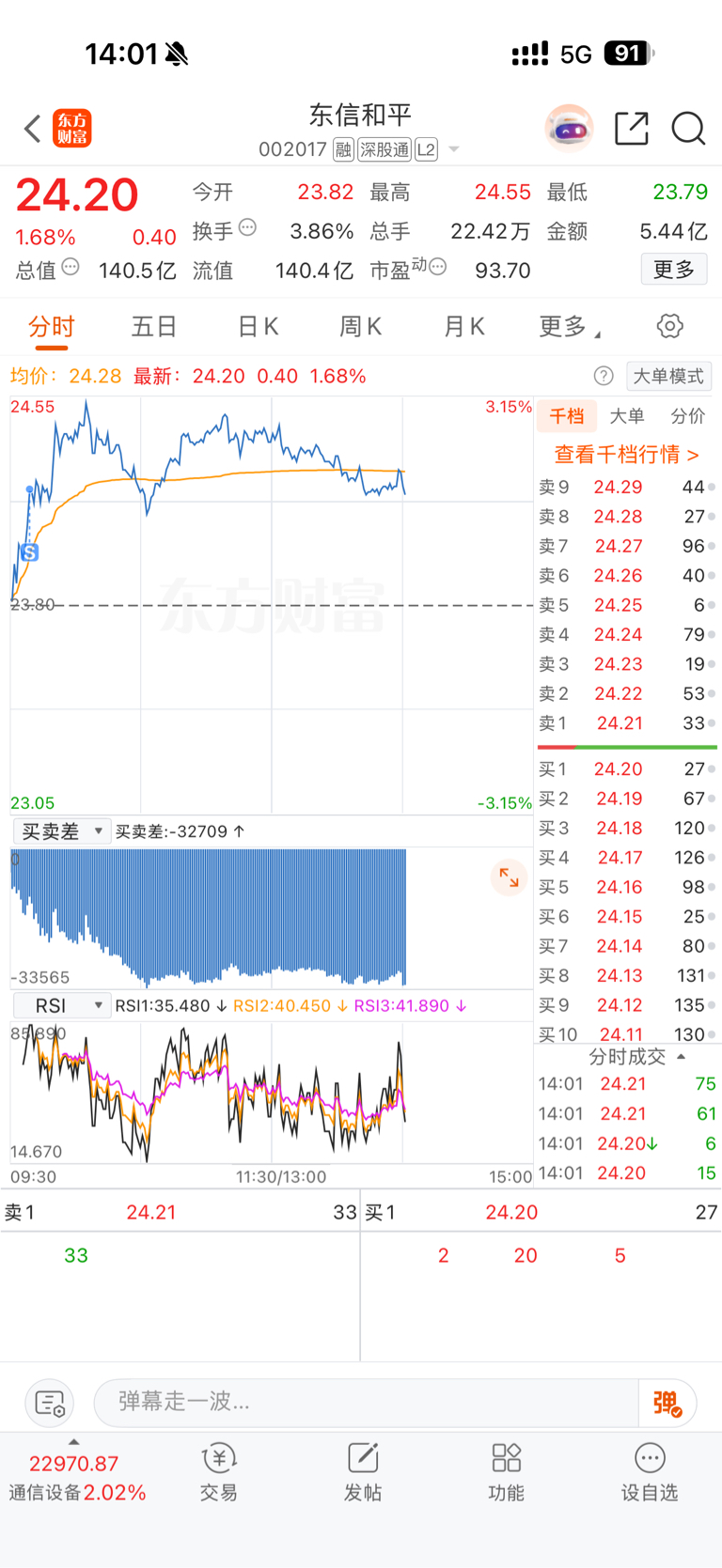 $东信和平(SZ002017)$ 我真的24.22卖的呀,为啥有人不信还骂人,真无语。。。。因为他老是每天冲高一个对子,然后下午掉到23.8这里