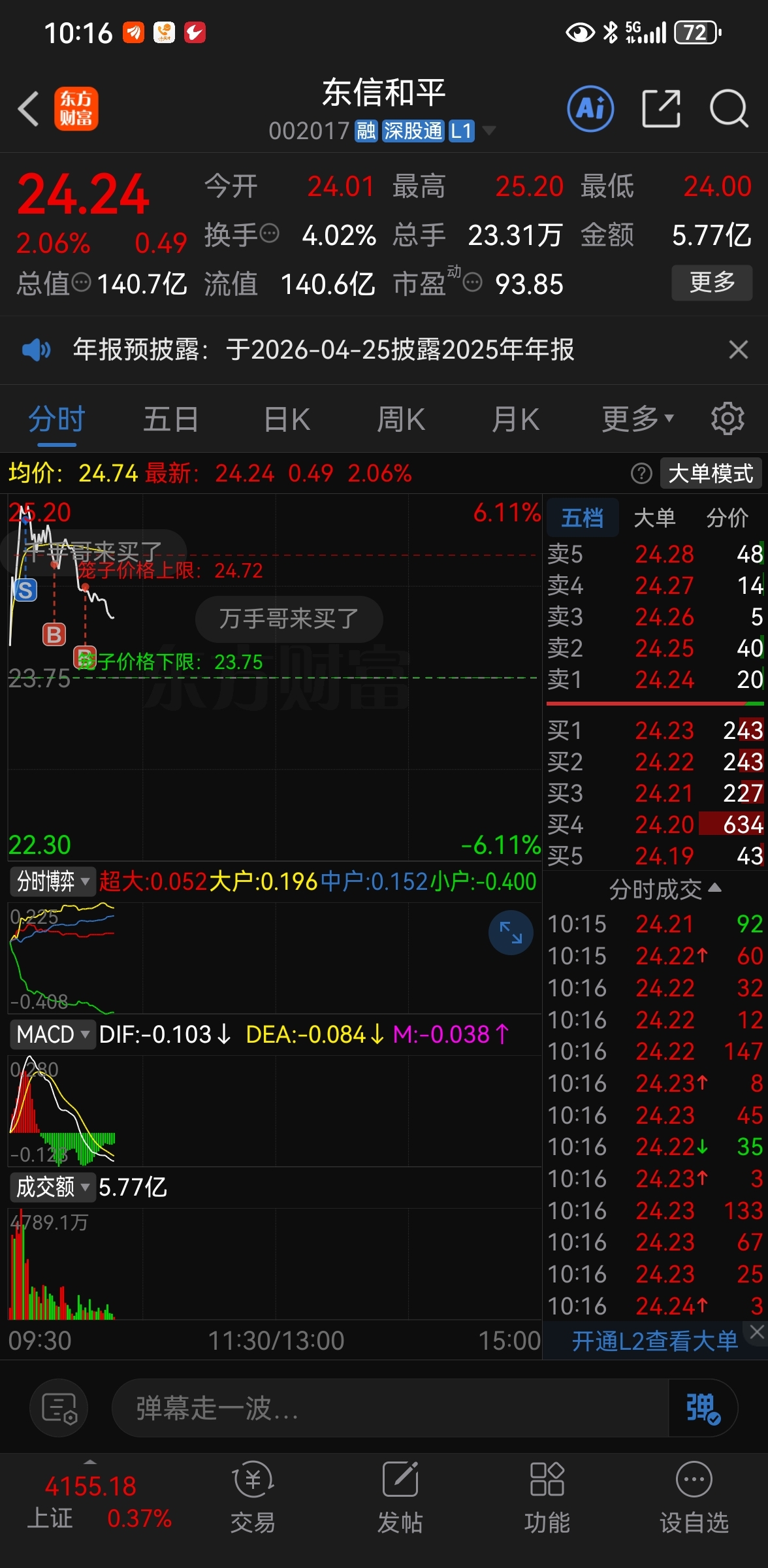 $东信和平(SZ002017)$ 25卖5000股,又分两次2500股接回来了!大不了就是今天高点T的利润还给你
