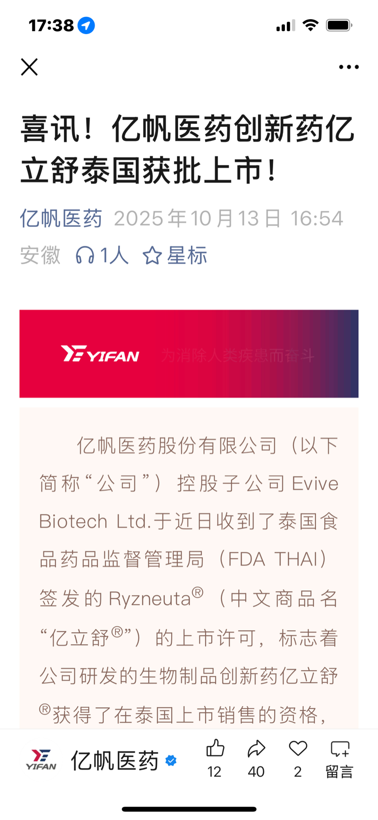 $亿帆医药(SZ002019)$ 亿帆医药创新药亿立舒泰国获批上市!
