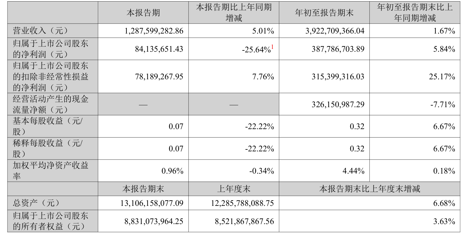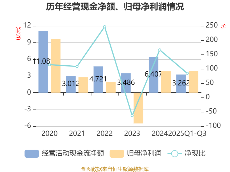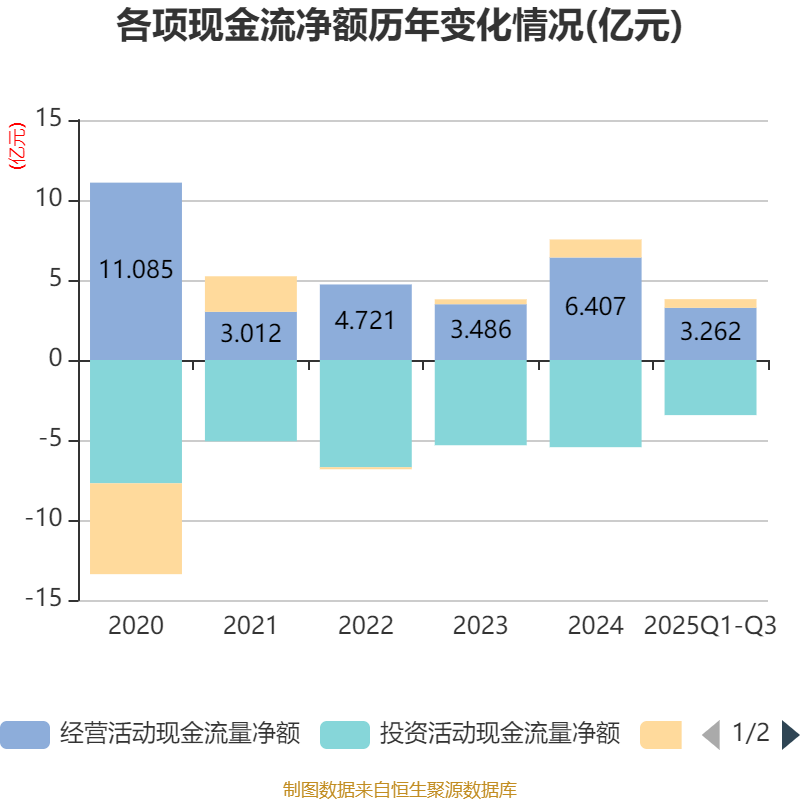 2025年前三季度,公司经营活动现金流净额为3.26亿元,同比下降7.71%;筹资活动现金流净额5398.71万元,同比减少2.91亿元;投资活动现金流净额-3.44亿元,上年同期为-3.69亿元。