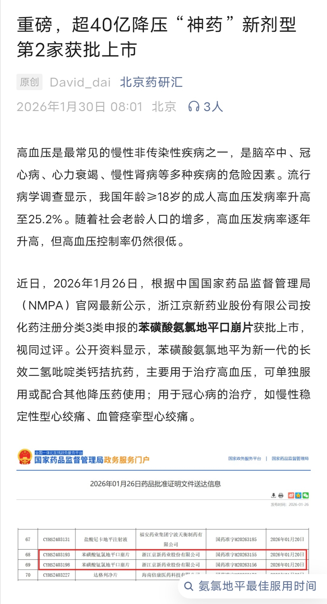 2012年,辉瑞预备将苯磺酸氨氯地平口崩片引入国内,但临床申请未被批准,截至目前,未在国内上市。2025年6月30日,万泰科创药业申报的苯磺酸氨氯地平口崩片获批上市,为国内首家+首仿。此次,京新药业的苯磺酸氨氯地平口崩片获批上市,为国内第2家。