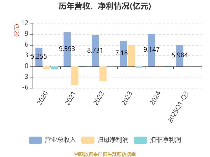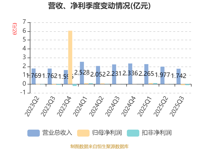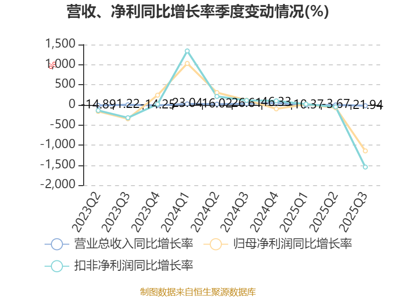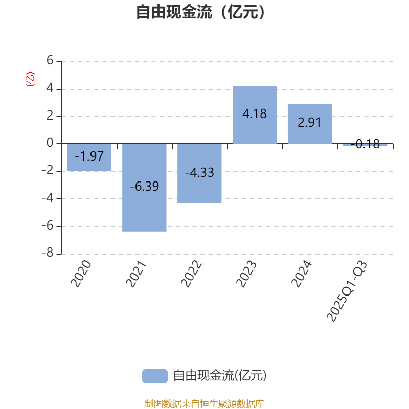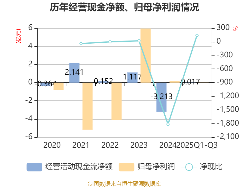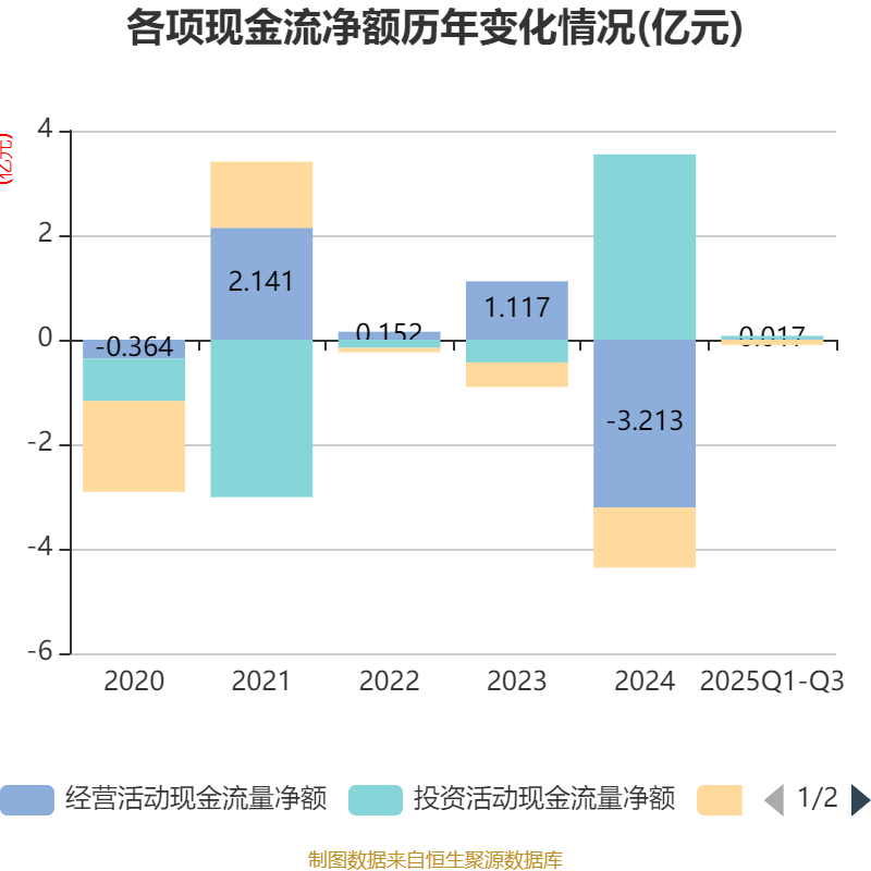 2025年前三季度,公司经营活动现金流净额为169.46万元,同比增加3.17亿元;筹资活动现金流净额-1006.29万元,同比增加9634.3万元;投资活动现金流净额568.14万元,上年同期为3.58亿元。