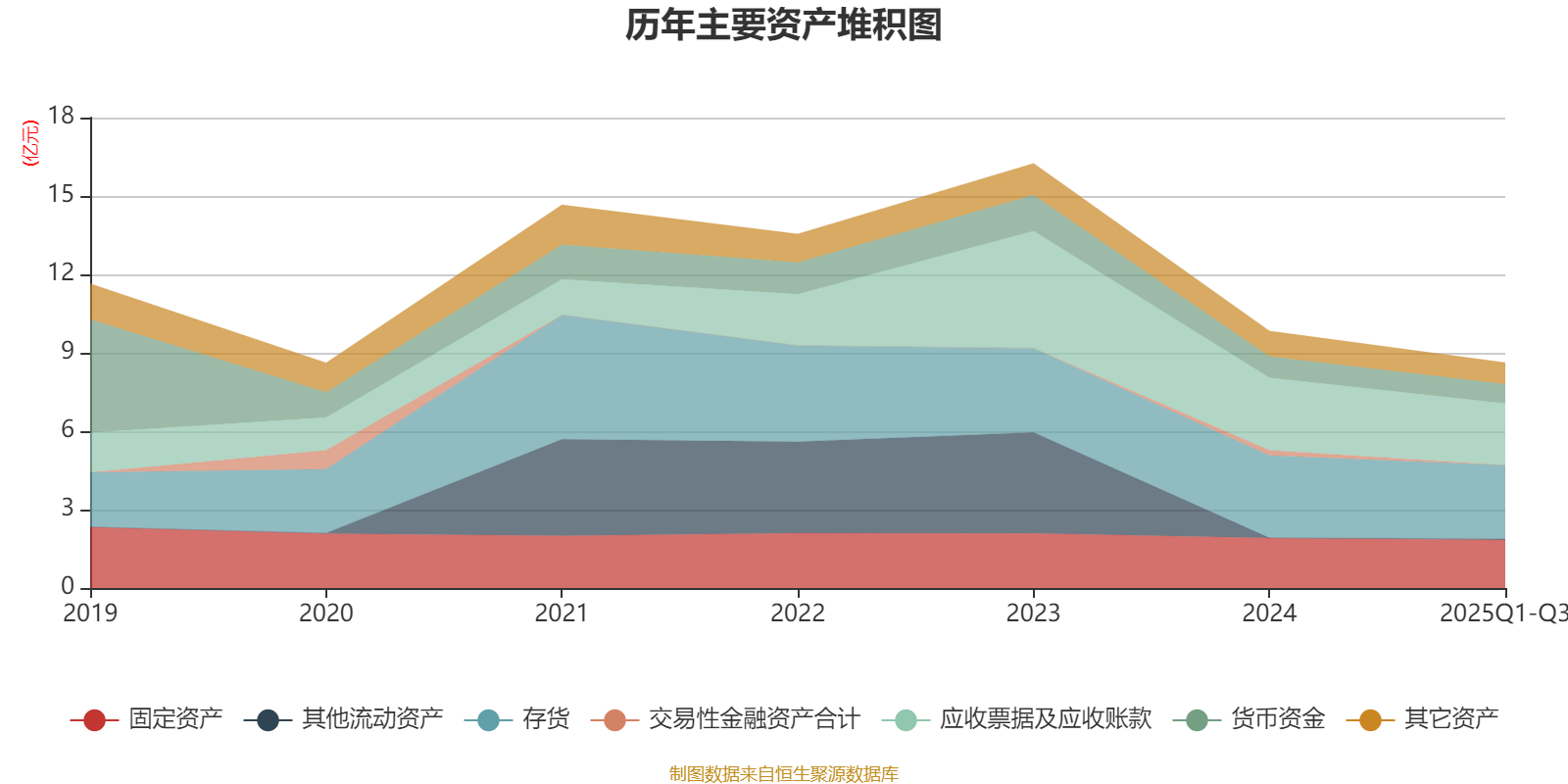 资产重大变化方面,截至2025年三季度末,公司交易性金融资产合计较上年末减少100%,占公司总资产比重下降2.07个百分点;固定资产较上年末减少4.11%,占公司总资产比重上升1.82个百分点;其他应收款(含利息和股利)较上年末减少86.46%,占公司总资产比重下降1.46个百分点;应收票据及应收账款较上年末减少14.83%,占公司总资产比重下降0.81个百分点。