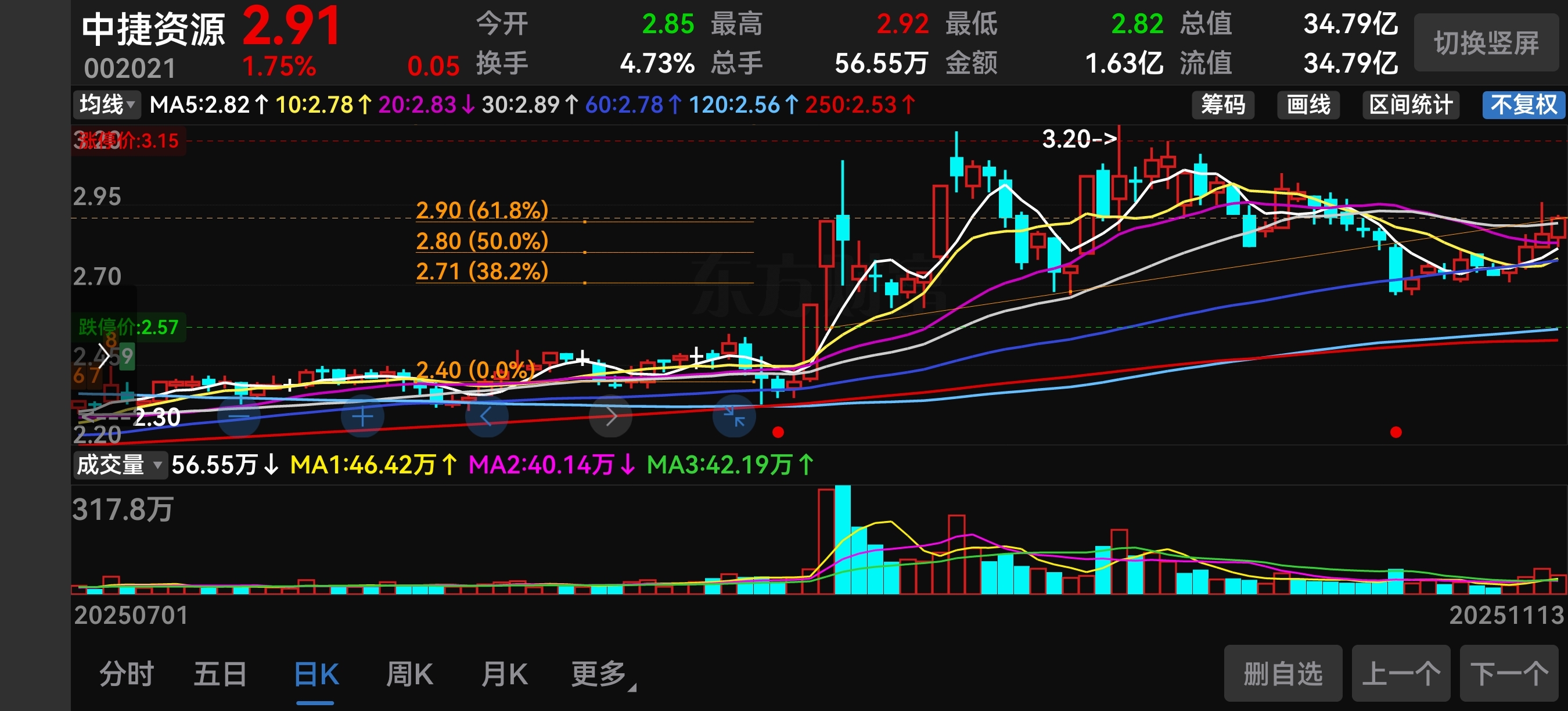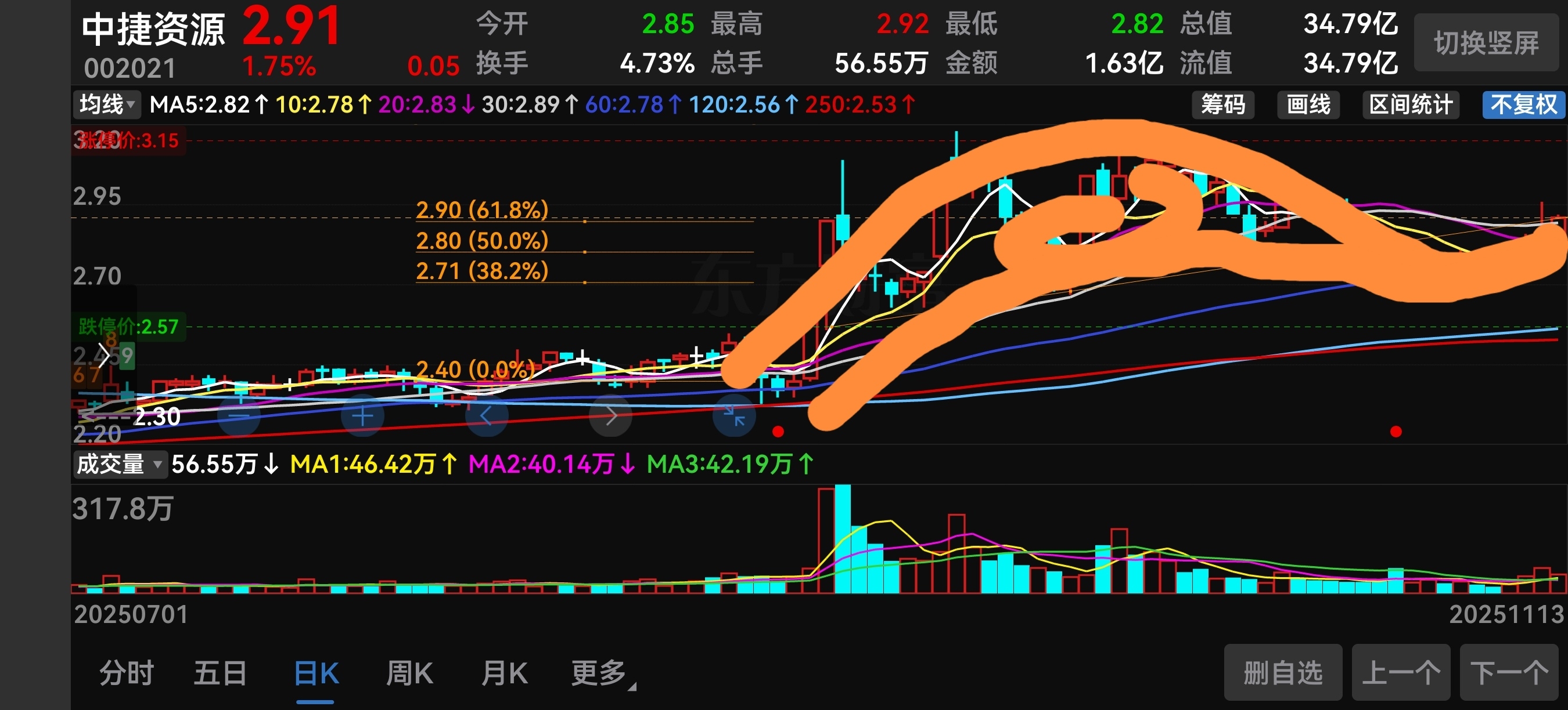 $中捷资源(SZ002021)$ 黄金分割线和老鸭头张口形态
