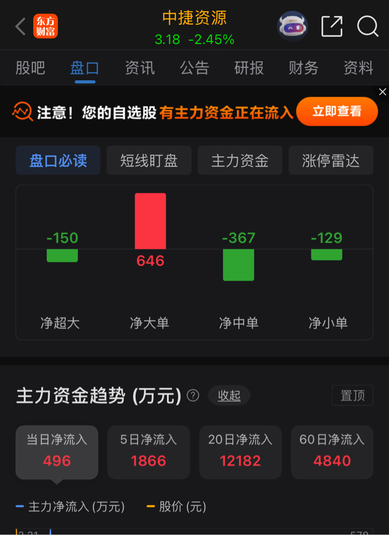 $中捷资源(SZ002021)$ 今天资金借调整建仓