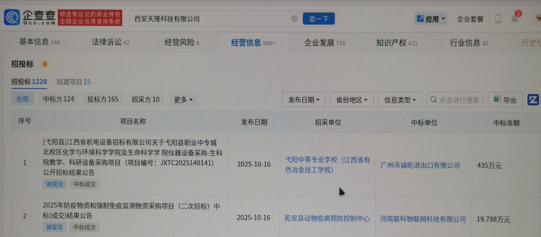 【又来喜讯】7月16日,子公司西安天隆中标江西省弋阳县职业中专仪器采购项目,总金