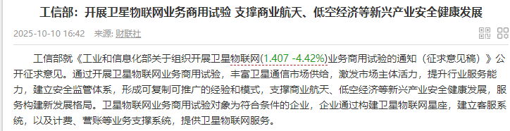 盘后利好:工信部:开展卫星物联网业务商用试验 支撑商业航天、低空经济等新兴产业安