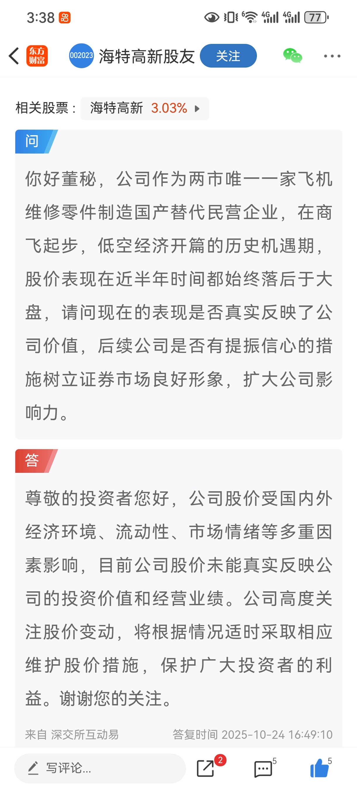 $海特高新(SZ002023)$ 我和董秘的感觉完全一样,海特高新对应大盘目前股价应该在25元左右