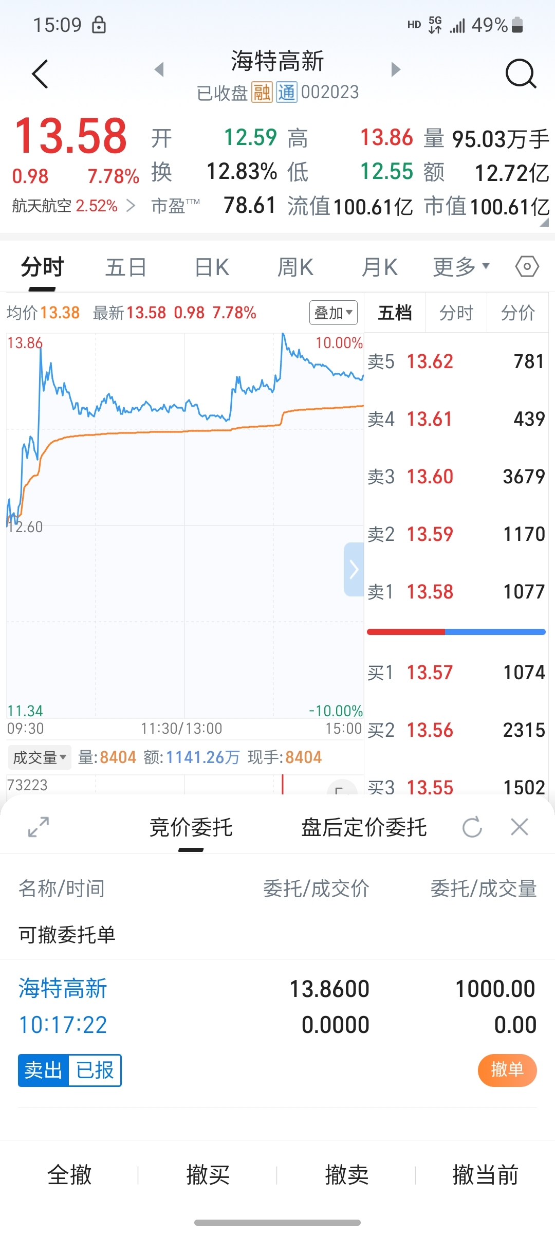 $海特高新(SZ002023)$ 感觉主力在玩把戏,涨停价只成交自己的挂单,多的一笔不要。我上午十点挂的涨停价卖出,没有成交。