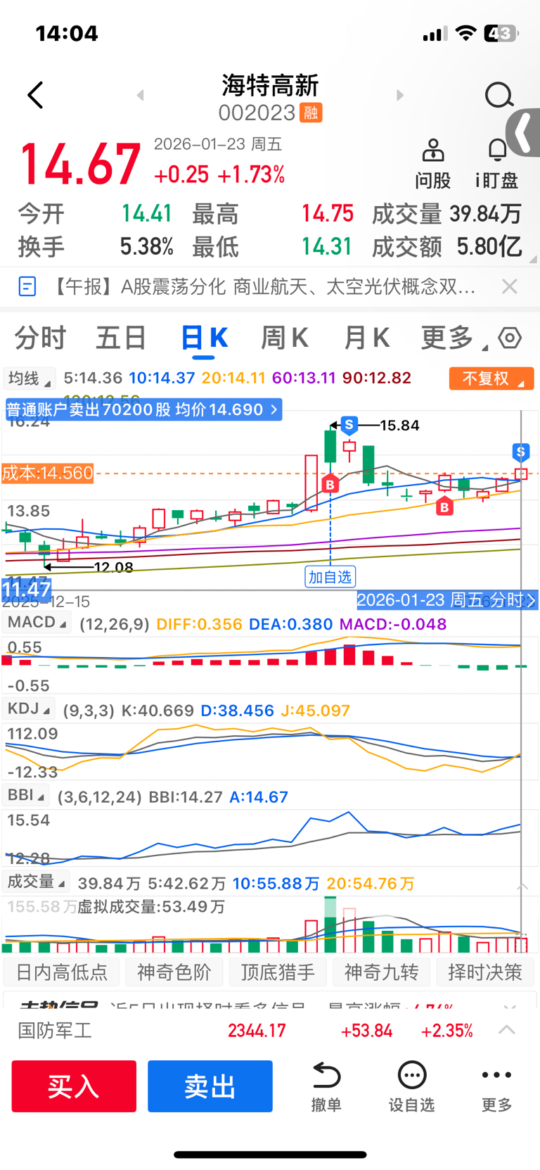 $海特高新(SZ002023)$ 没信心了,赚点就出