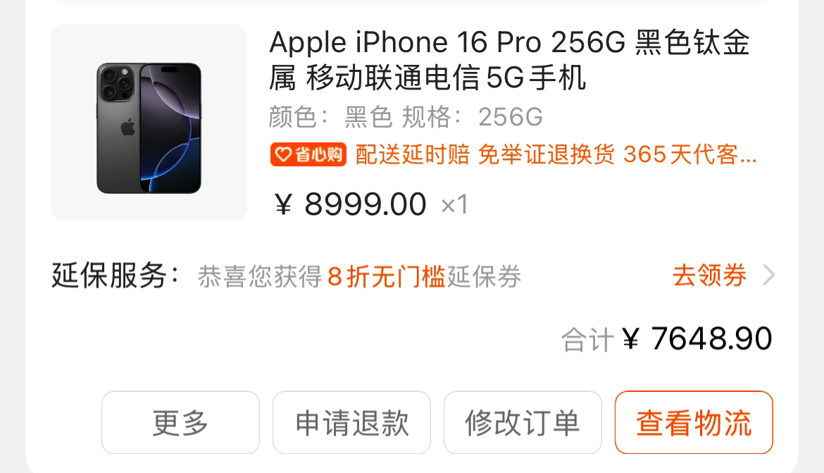 苏宁下单iphone16pro256G,比京东便宜300,作为股东也支持一下了