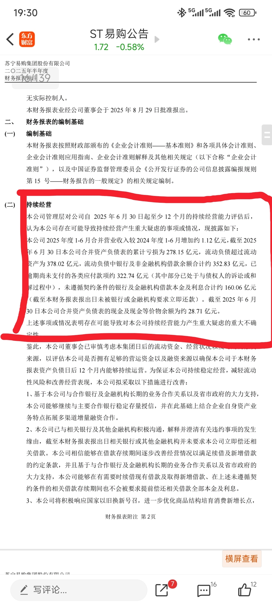 $ST易购(SZ002024)$ 根据今年的中报所记载,是否存在持续经营不确定性,实际上是由管理层自评的。管理层自己认为存在持续经营不确定性,记入财报,于是就暂不摘帽。这种定性,并非由监管机构自上而下的给出结论,不予摘帽