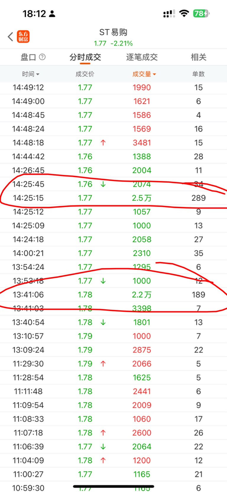 $ST易购(SZ002024)$ 问大家像不太像阿里减持。 但是不知道这两笔砸单脑子有什么回路??? 也不知道前俩天1.85成交了60万手今天拿来砸盘??? 1.86.1.85都没卖出去抛多少。非要割肉1.77来砸盘????...勾主力你。我无所谓。我1.7多多梭哈的。有种你砸退市