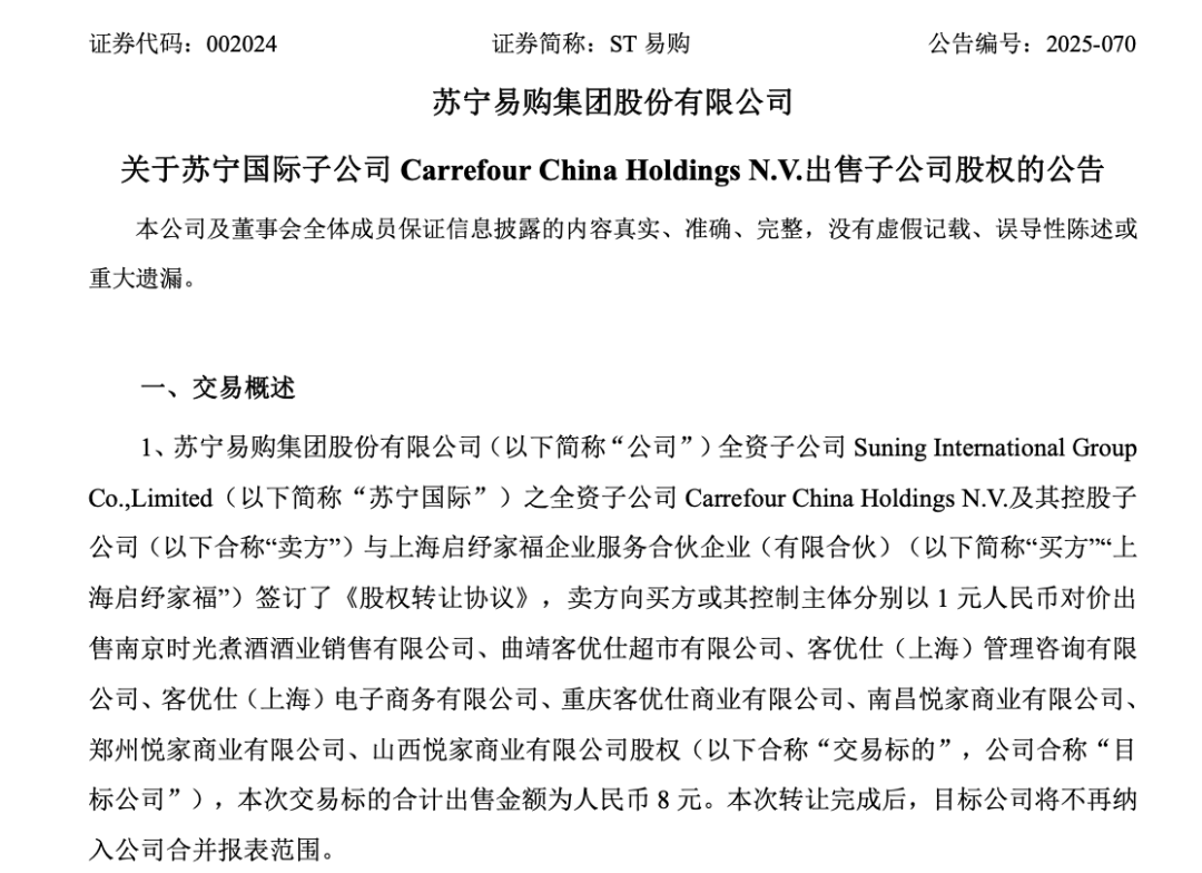 12月10日晚间,ST易购公告称,公司全资子公司苏宁国际的全资子公司Carrefour China Holdings N.V.及其控股子公司(简称“卖方”)与上海启纾家福企业服务合伙企业(有限合伙)(简称“买方”)签订了《股权转让协议》。