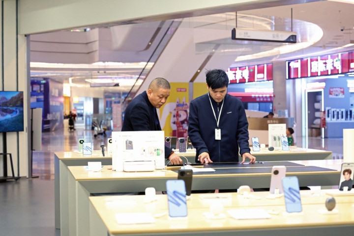 梅陇一家华为专卖店,顾客在体验折叠手机。