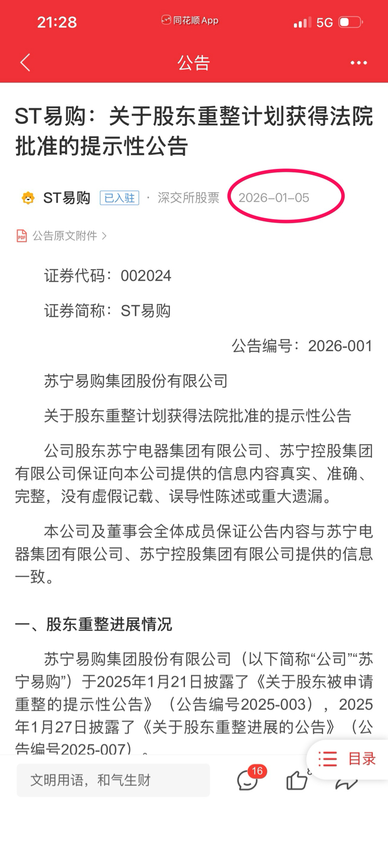 $ST易购(SZ002024)$ 大家记住1月5号这个日子,易购公告苏宁系重整通过,阿里卡在这个点开始减持,前面明明有更高的价格和更大的成交量配合轻松减持,可阿里选择一股不卖,要说这是巧合,反正我是不信的!