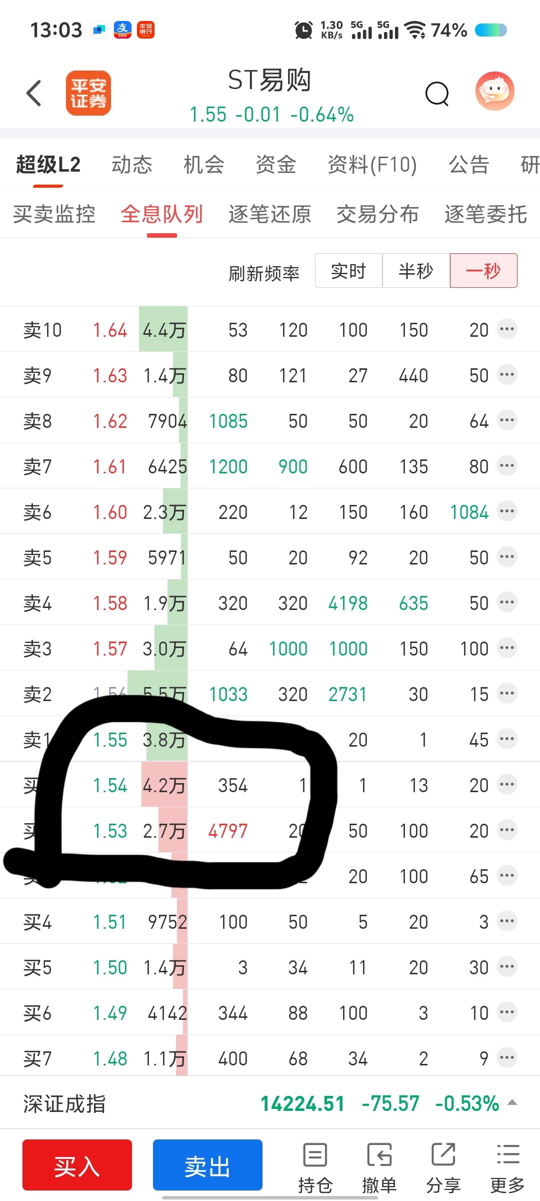 只要看到买一买二最前面有5000手大单,最起码一分T能做出来