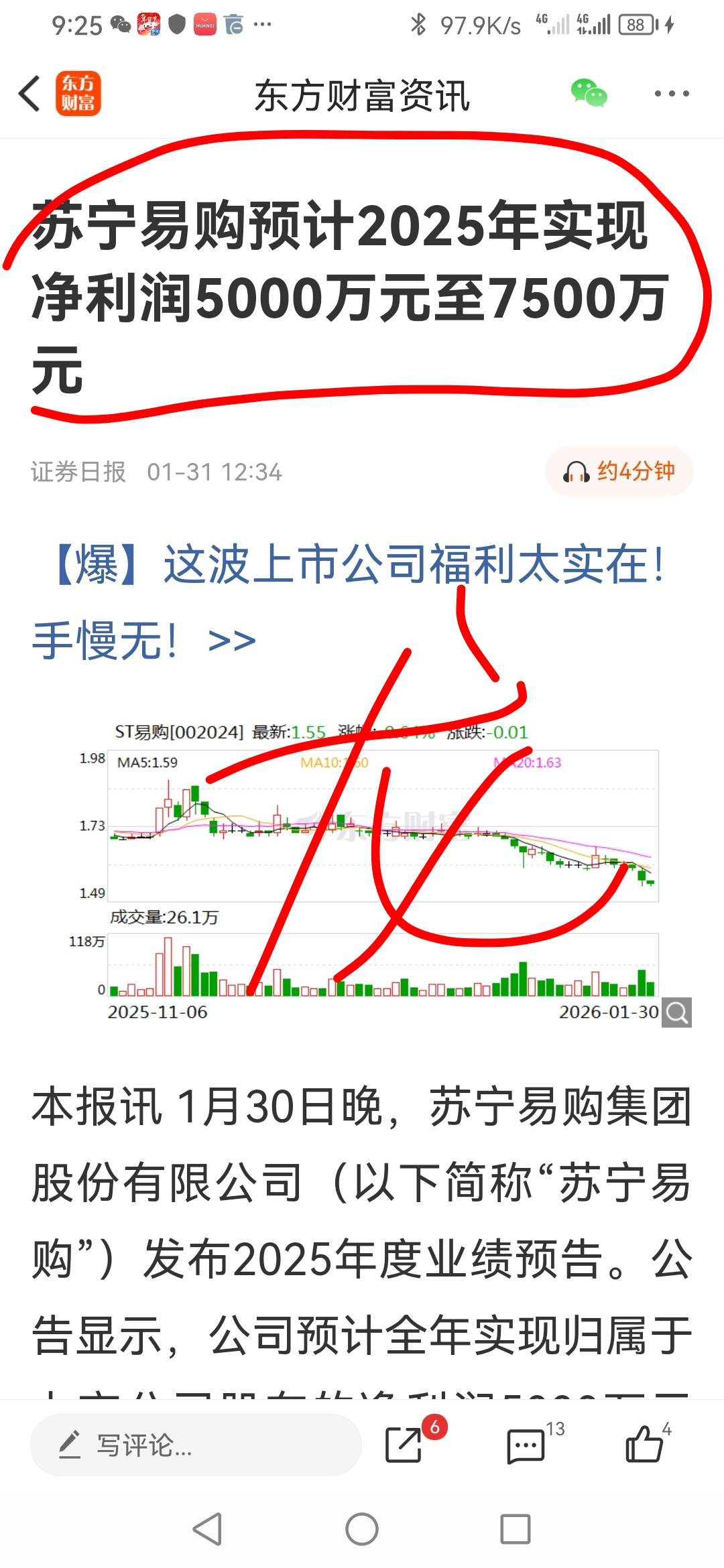 苏宁易购预计2025年实现净利润5000万元至7500万元$宁德时代(SZ300750)$  $贵州茅台(SH600519)$  #段永平谈茅台:当前股价“真的不贵”#  #股市怎么看#  #实盘记录#  #强势机会#  #炒股日记#