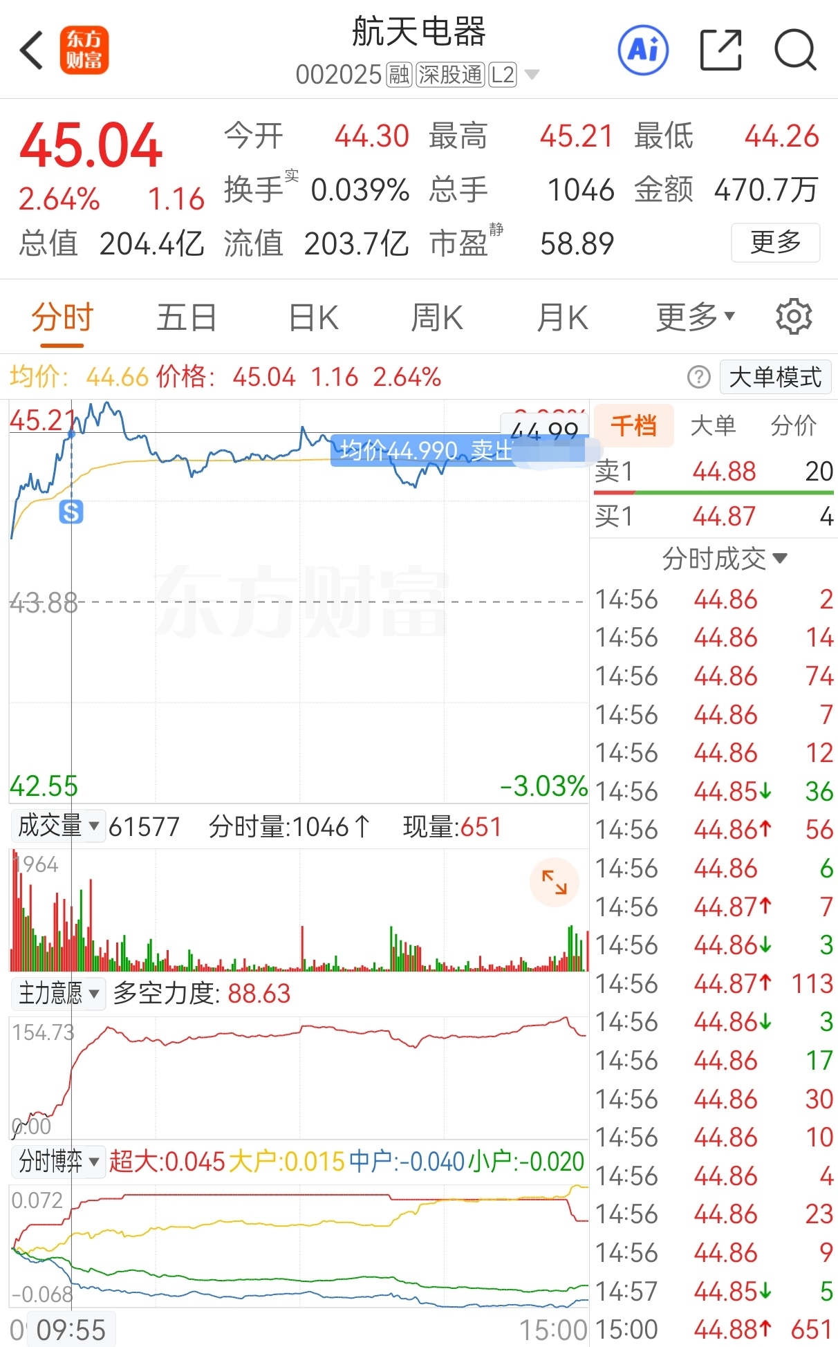 $航天电器(SZ002025)$ 原计划今买明卖,实际44.26买,43.88加仓,44.99卖,实盘短线套利航天电器,成功收米走人!