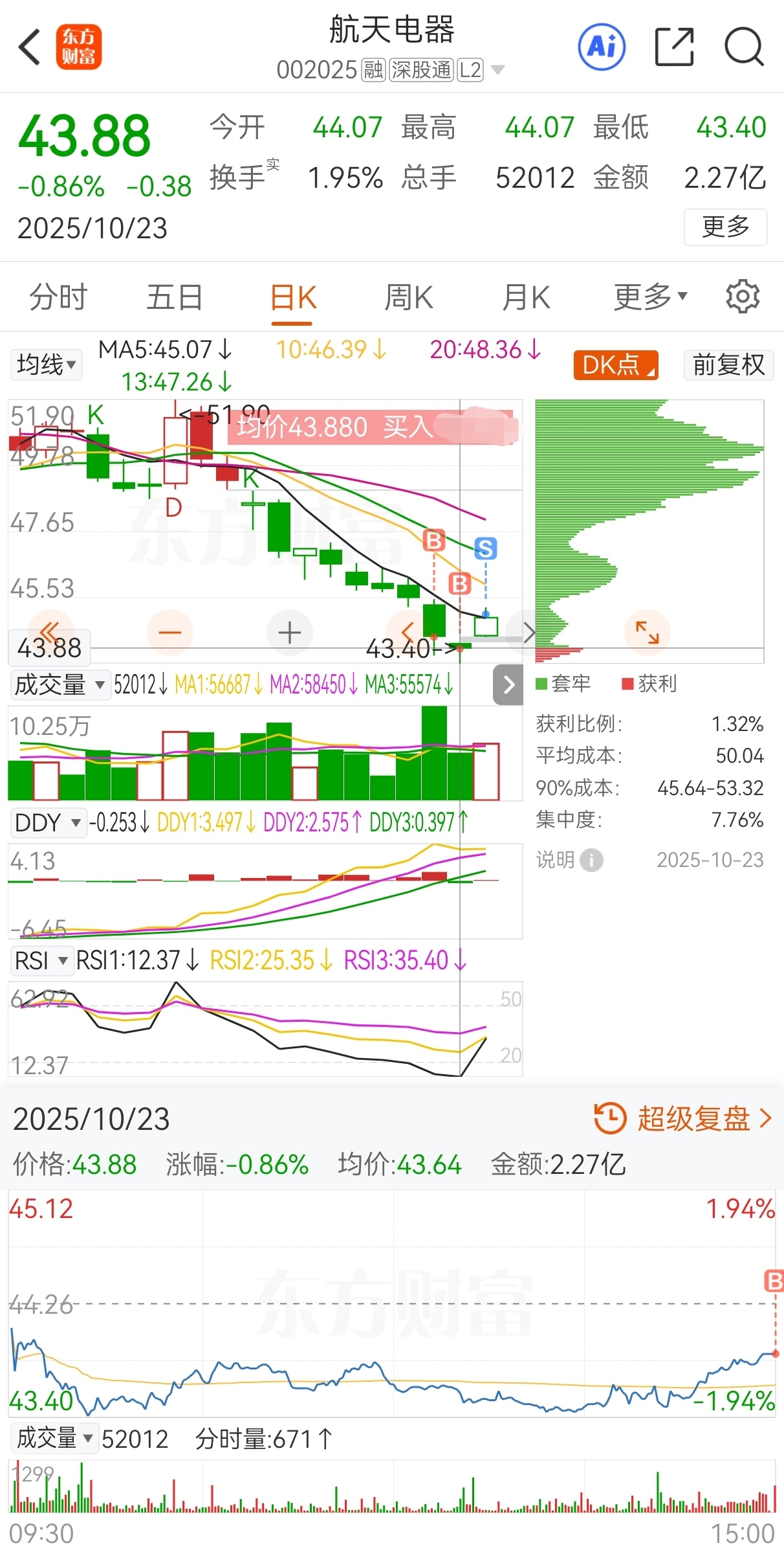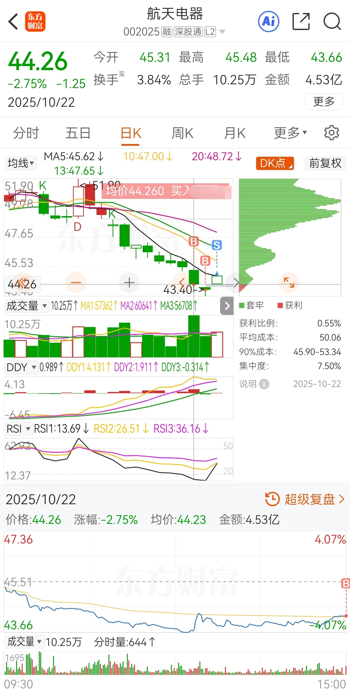 原计划今买明卖,实际44.26买,43.88加仓,44.99卖,实盘短线套利航天