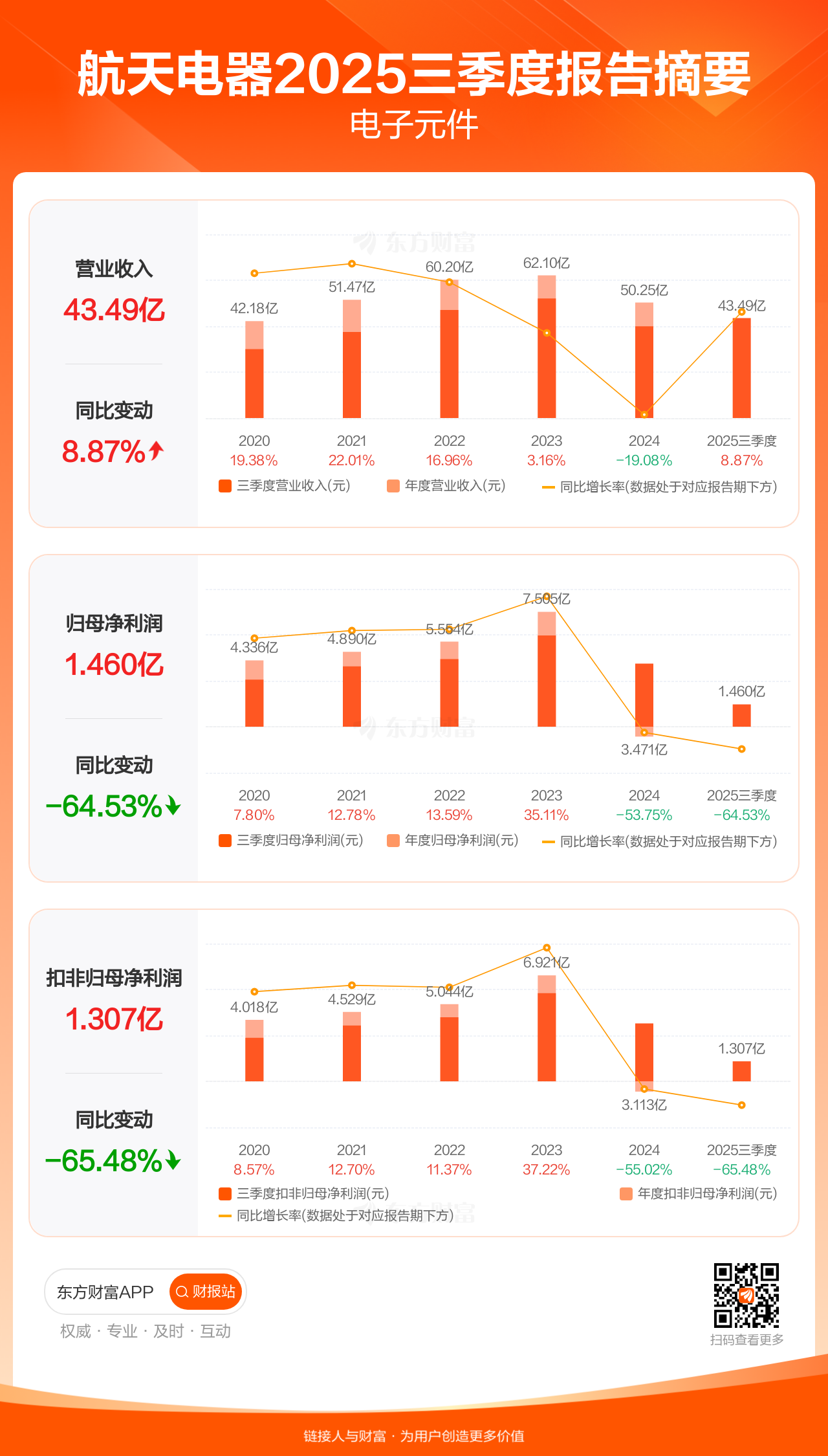 航天电器10月30日发布2025年三季报显示,公司前三季实现营业收入43.49亿元,同比增长8.87%;归母净利润1.46亿元,同比下滑64.53%;扣非归母净利润1.31亿元,同比下滑65.48%。