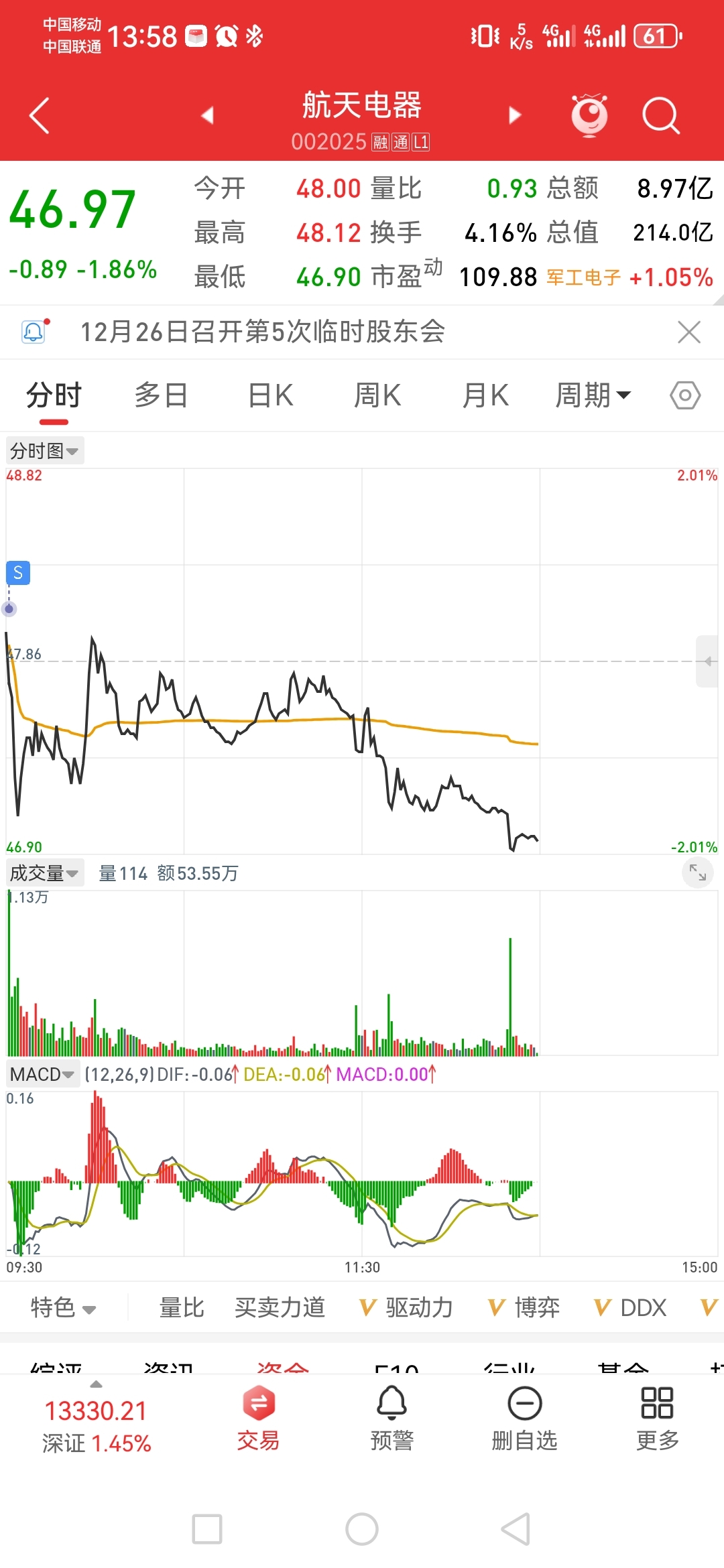 $航天电器(SZ002025)$ 开盘48.11全部清仓