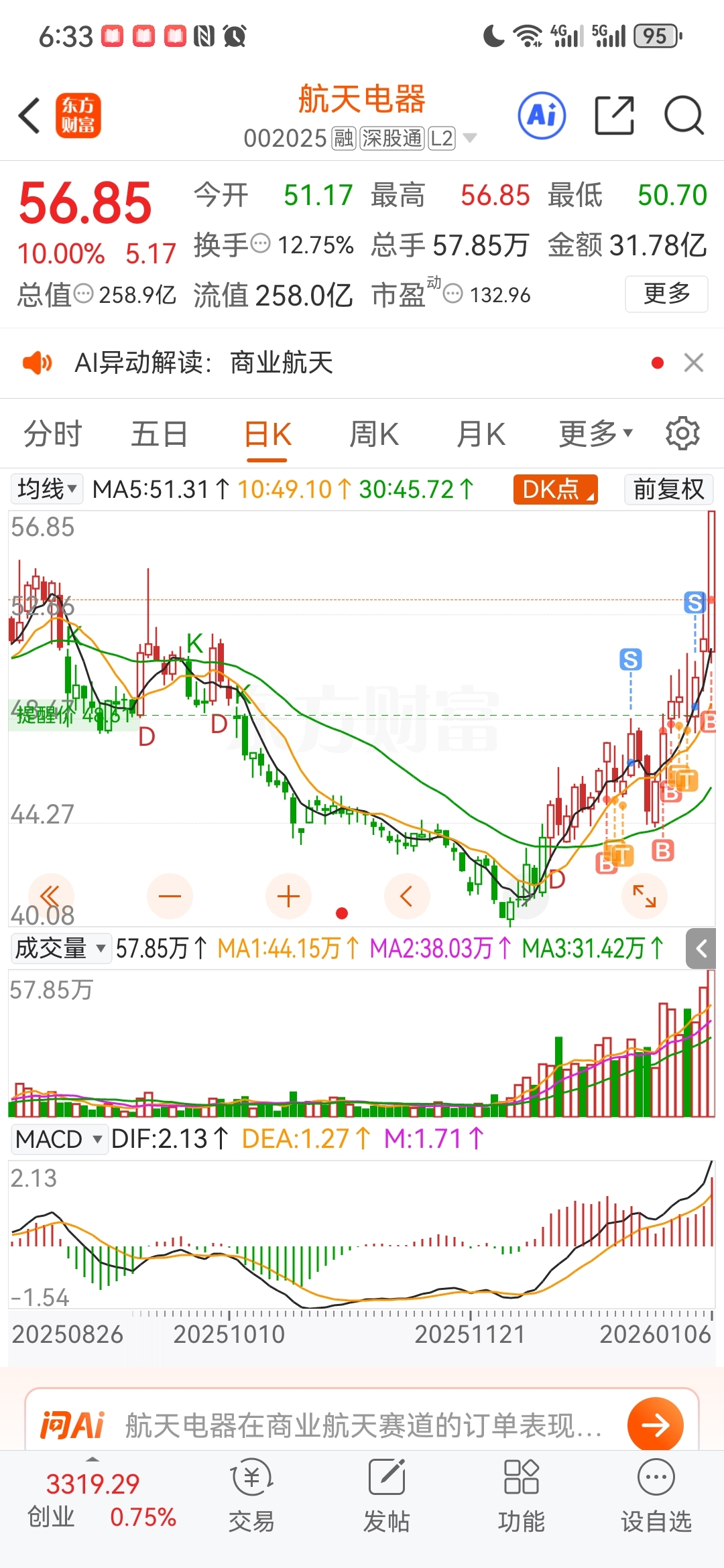 $航天电器(SZ002025)$ 等了这么久,总算放量来了个首板了,这一波最低翻倍,先看到80。80一下最多做T绝对不能被洗下车。先后卖飞发展,动力,电子。电器中途也被洗过,首板启动后没到目标价坚决拿稳了,大家一起加油。