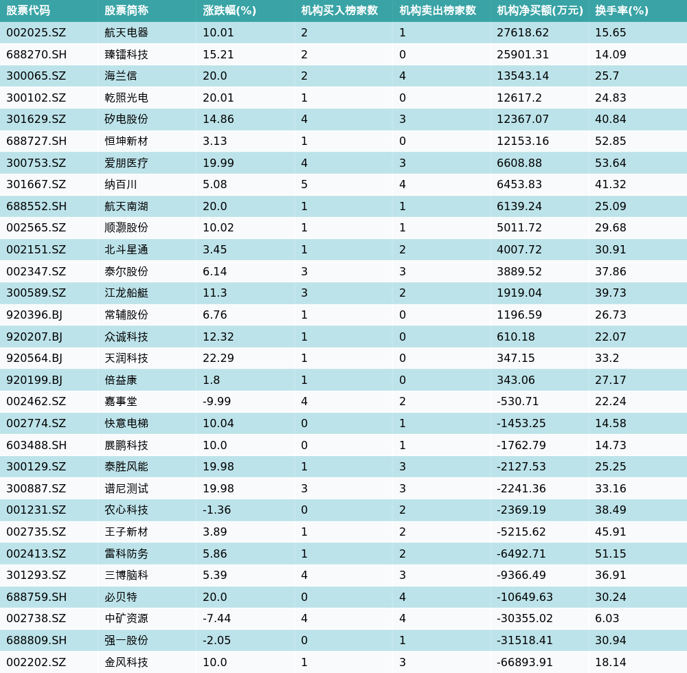 南财智讯1月8日电,南财金融终端数据显示,因当日异动登上龙虎榜的个股中,30只沪深A股龙虎榜出现了机构的身影,机构合计净卖出30249.19万元,具体来看,机构净买入17只个股,净卖出13只个股。其中,机构净买入前三分别为航天电器(002025.SZ)、臻镭科技(688270.SH)与海兰信(300065.SZ),详情见下图:机构净卖出的个股中,前三分别为金风科技(002202.SZ)、强一股份(688809.SH)与中矿资源(002738.SZ)。