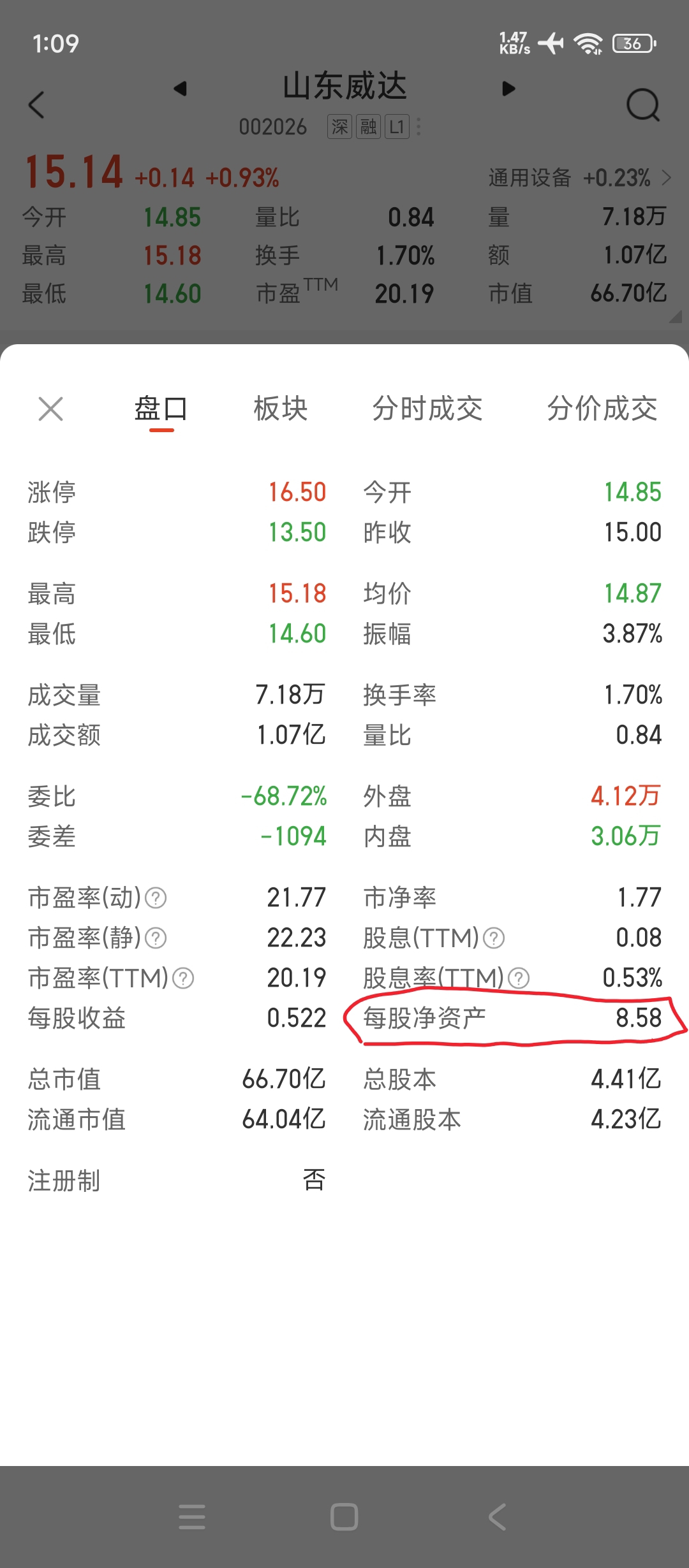 $山东威达(SZ002026)$ 8.58净资产,每年负债降低,赢盈利,社保基金参股,2~3倍股价,17~24块左右,股票严重低估。
