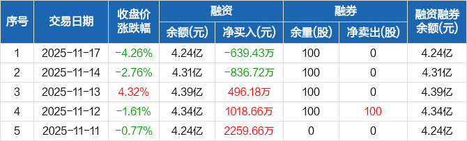 山东威达:融资净偿还639.43万元,融资余额4.24亿元(11-17)