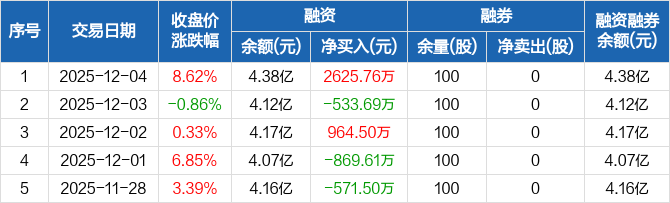 融资方面,当日融资买入8617.01万元,融资偿还5991.25万元,融资净买入2625.76万元。融券方面,融券卖出0股,融券偿还0股,融券余量100股,融券余额1613元。融资融券余额合计4.38亿元。