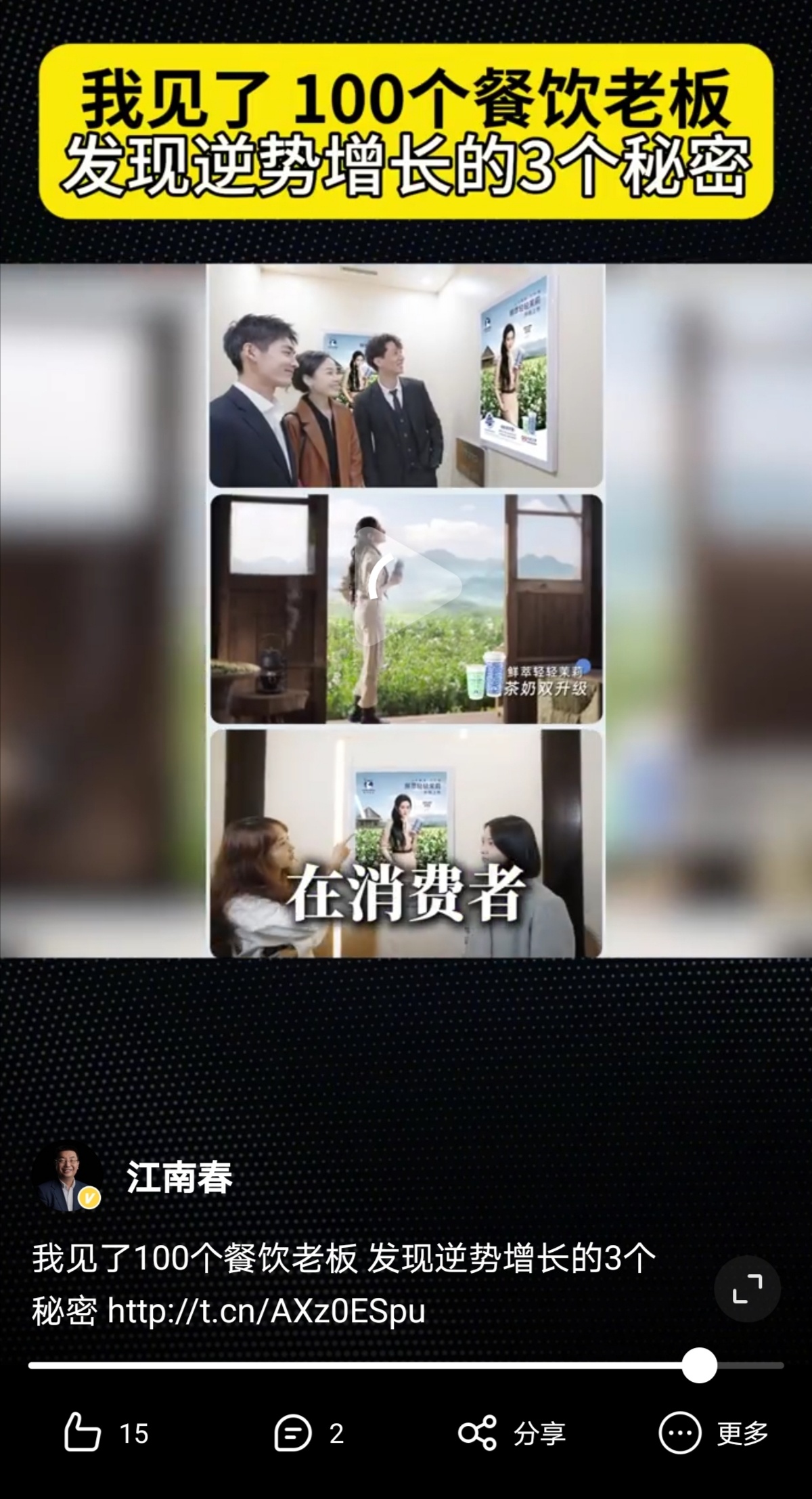 最近看到,江南春在九个月的时间内,拜访了100家餐饮企业,平均每个月11家,可以说是不折不扣的“卷王”。