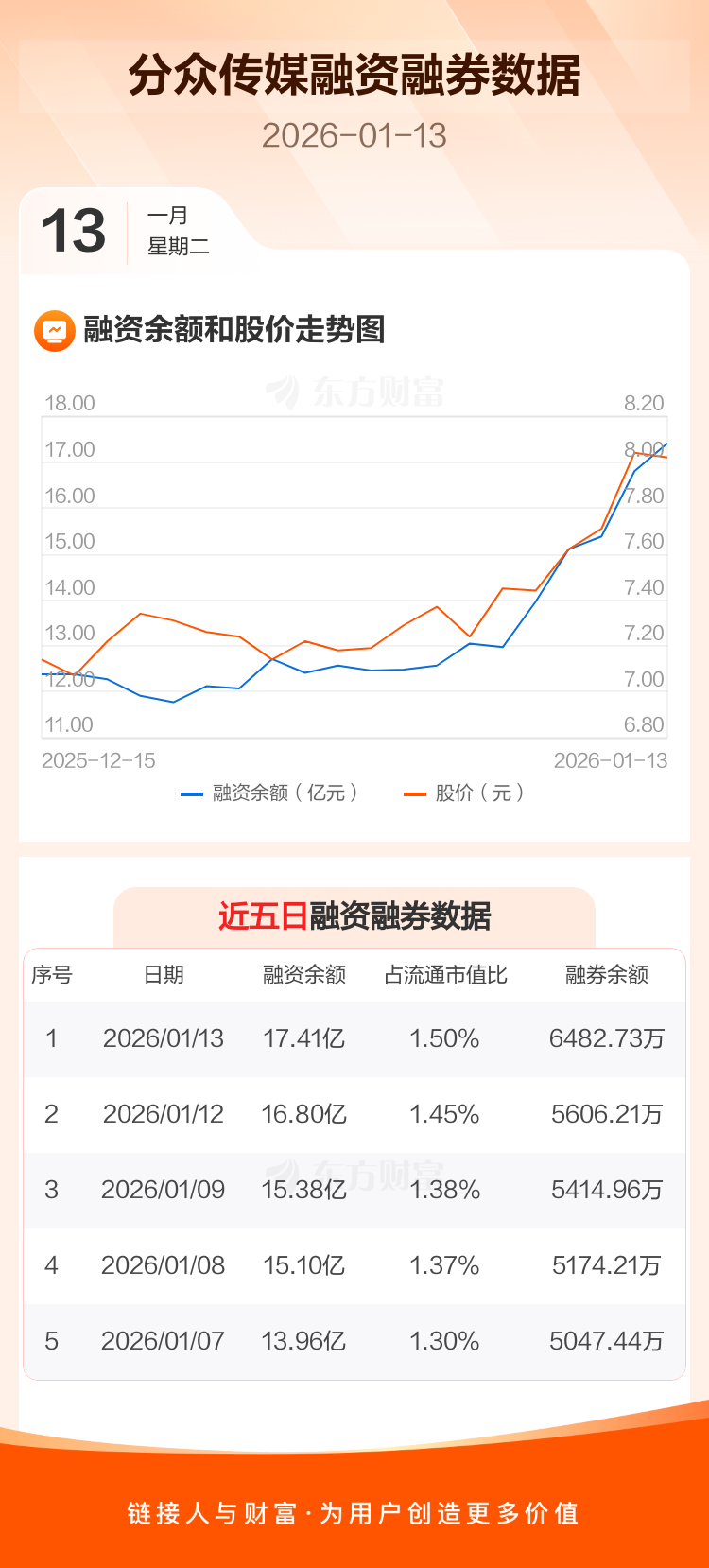 交易所最新数据显示,分众传媒于2026年1月13日获融资买入2.87亿元,融资偿还2.26亿元,当日融资净买入6081.15万元。目前,该股融资余额17.41亿,占流通市值比例为1.50%。