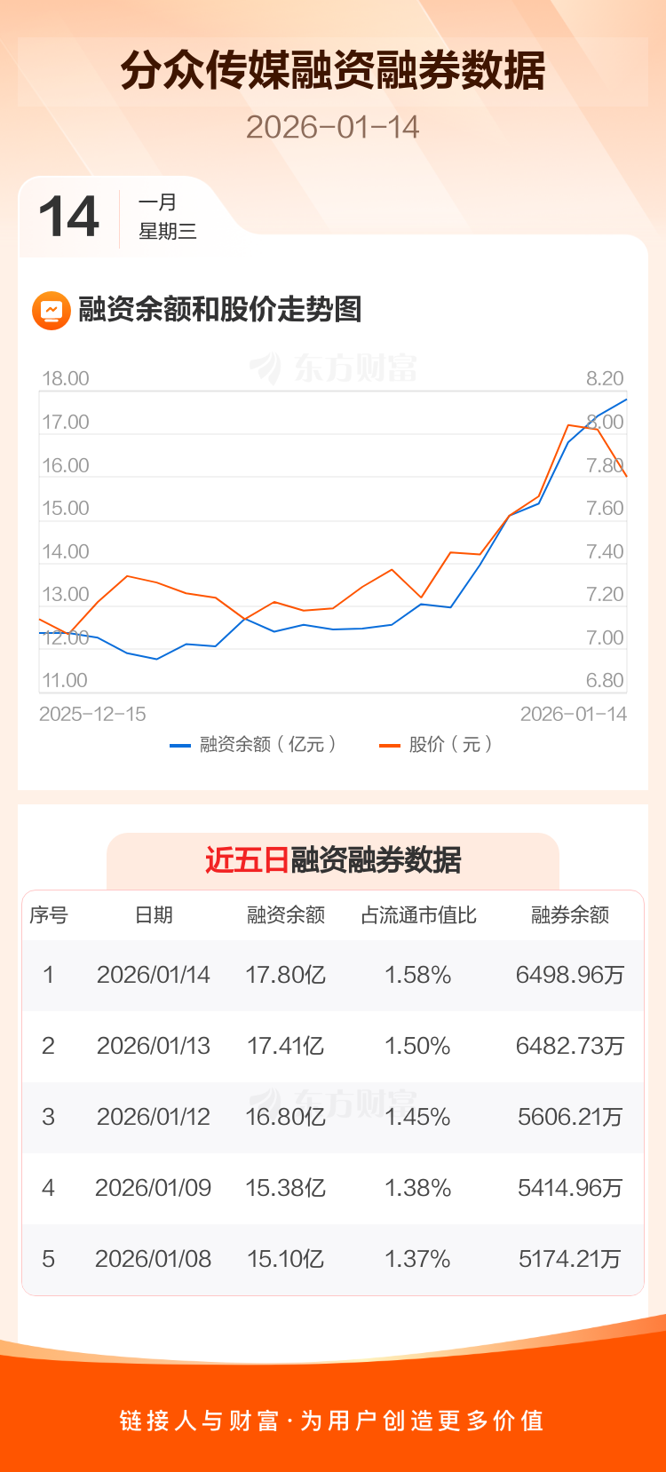 交易所最新数据显示,分众传媒于2026年1月14日获融资买入2.57亿元,融资偿还2.18亿元,当日融资净买入3874.51万元。目前,该股融资余额17.80亿,占流通市值比例为1.58%。