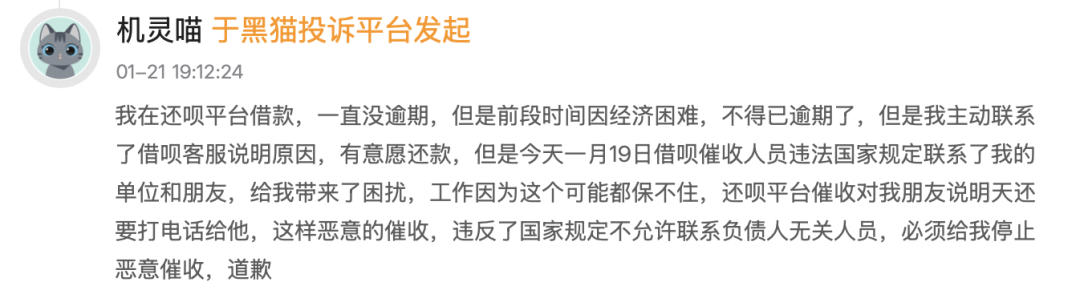 “我在还呗平台借款一直没逾期,但是前段时间因经济困难,不得已逾期了,但是我主动联系了客服说明原因,有意愿还款。”另一用户表示,“但是今天1月19日催收人员违反规定联系单位同事和朋友,给我带来了困扰,工作也可能都保不住。”