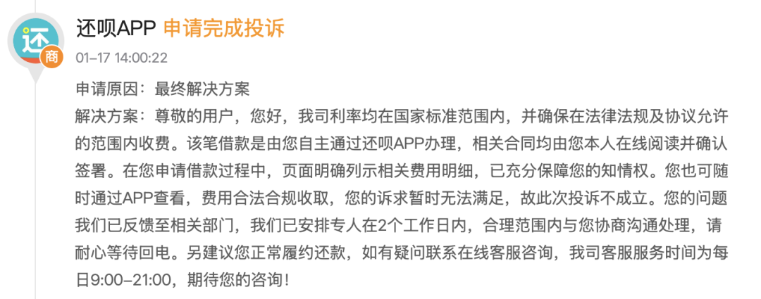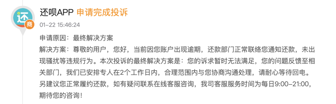 对此,还呗在黑猫平台回复称,属于还款部门正常联络通知还款,未出现骚扰等违规行为。针对用户质疑的第三方催收情况并未回应,同时,还呗还向平台提交了本次投诉完成的申请。